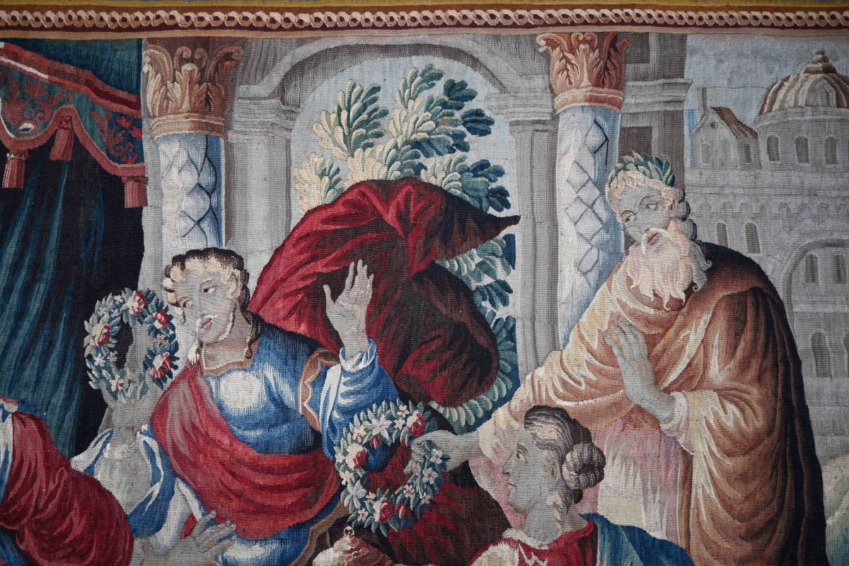 The tapestry displays a sumptuous palette characteristic of 18th-century Aubusson: