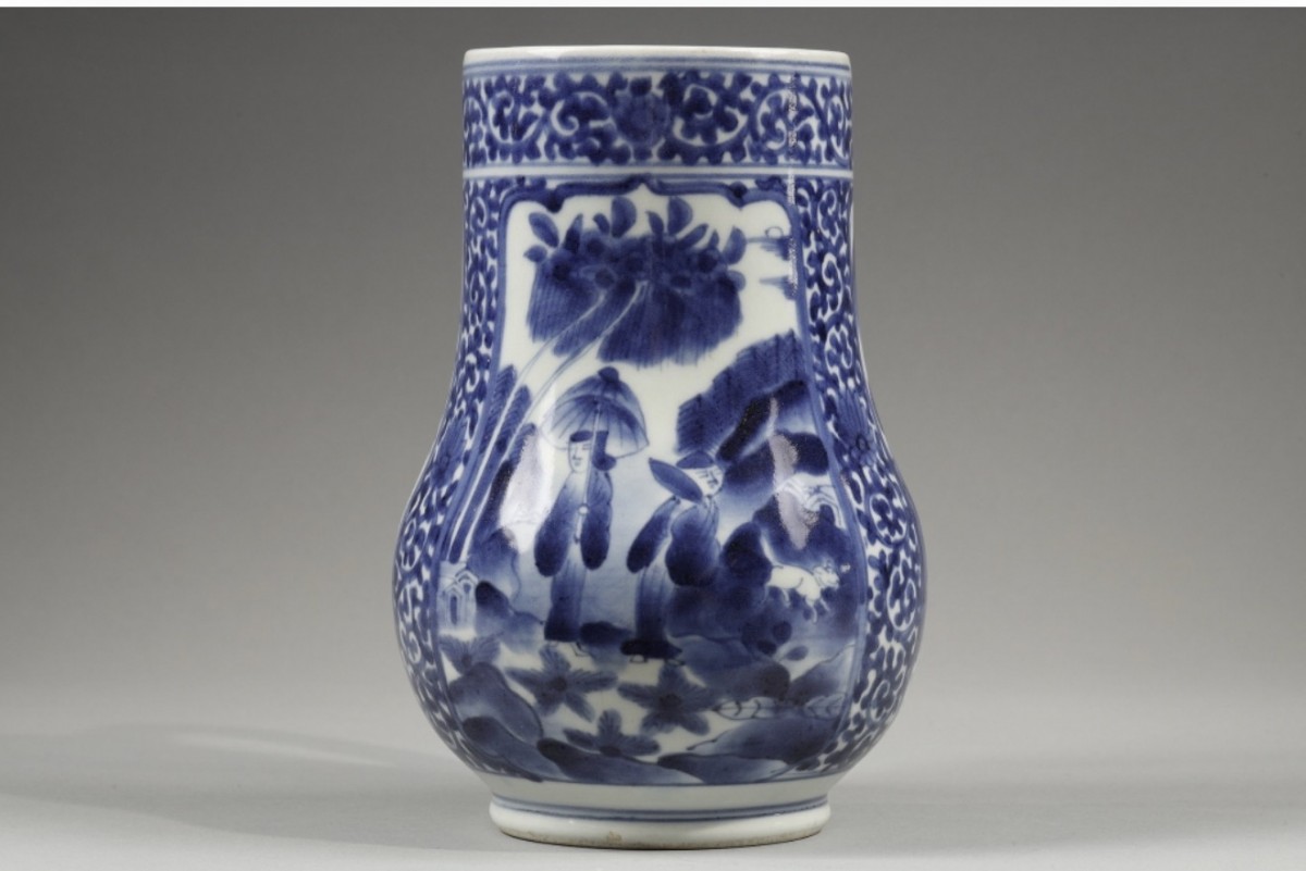 Large baluster?shaped porcelain ewer decorated in underglaze blue, featuring in the central reserve a lady with a parasol accompanied by her maid and a small dog, framed by birds and a mountainous landscape with a pagoda in two additional cartouches.