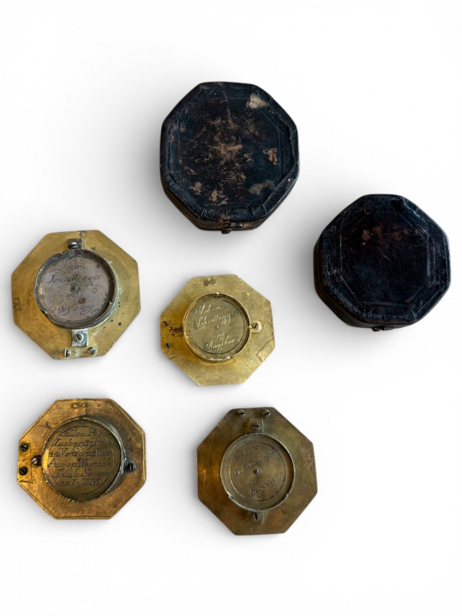 Rare and refined collection of four octagonal brass portable sundials, each incorporating a magnetic compass, produced in Augsburg, one of Europe’s leading centers for scientific instrument making during the 17th and 18th centuries.