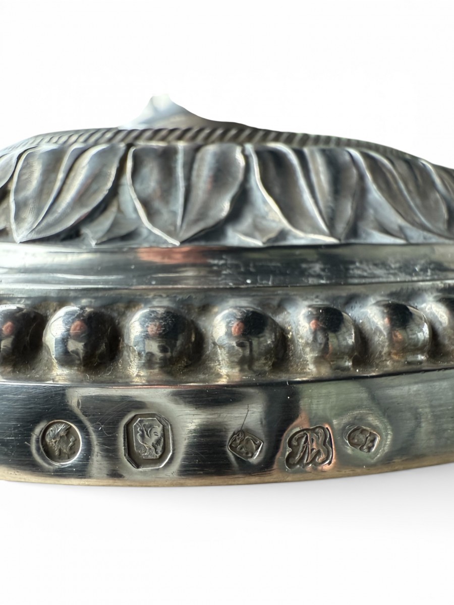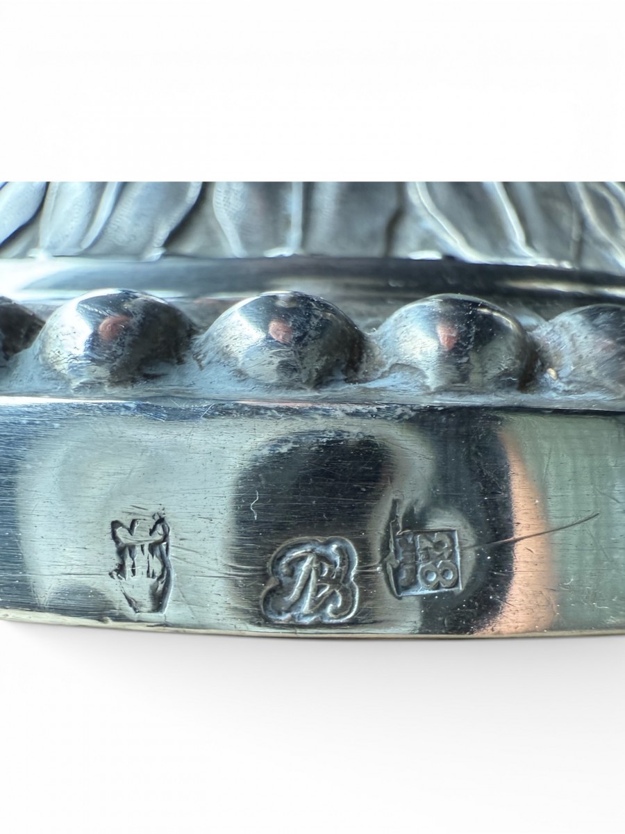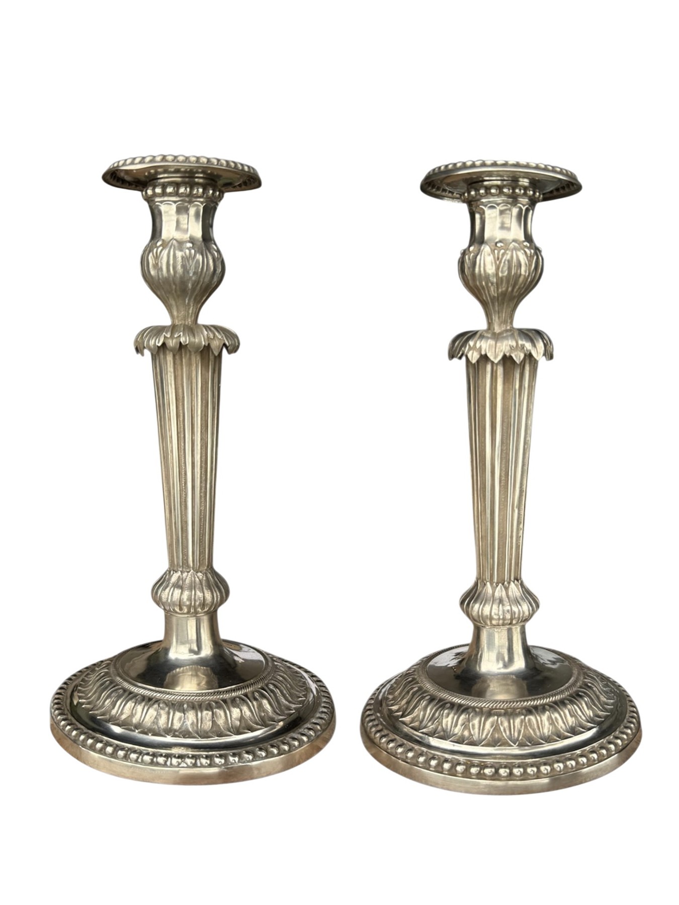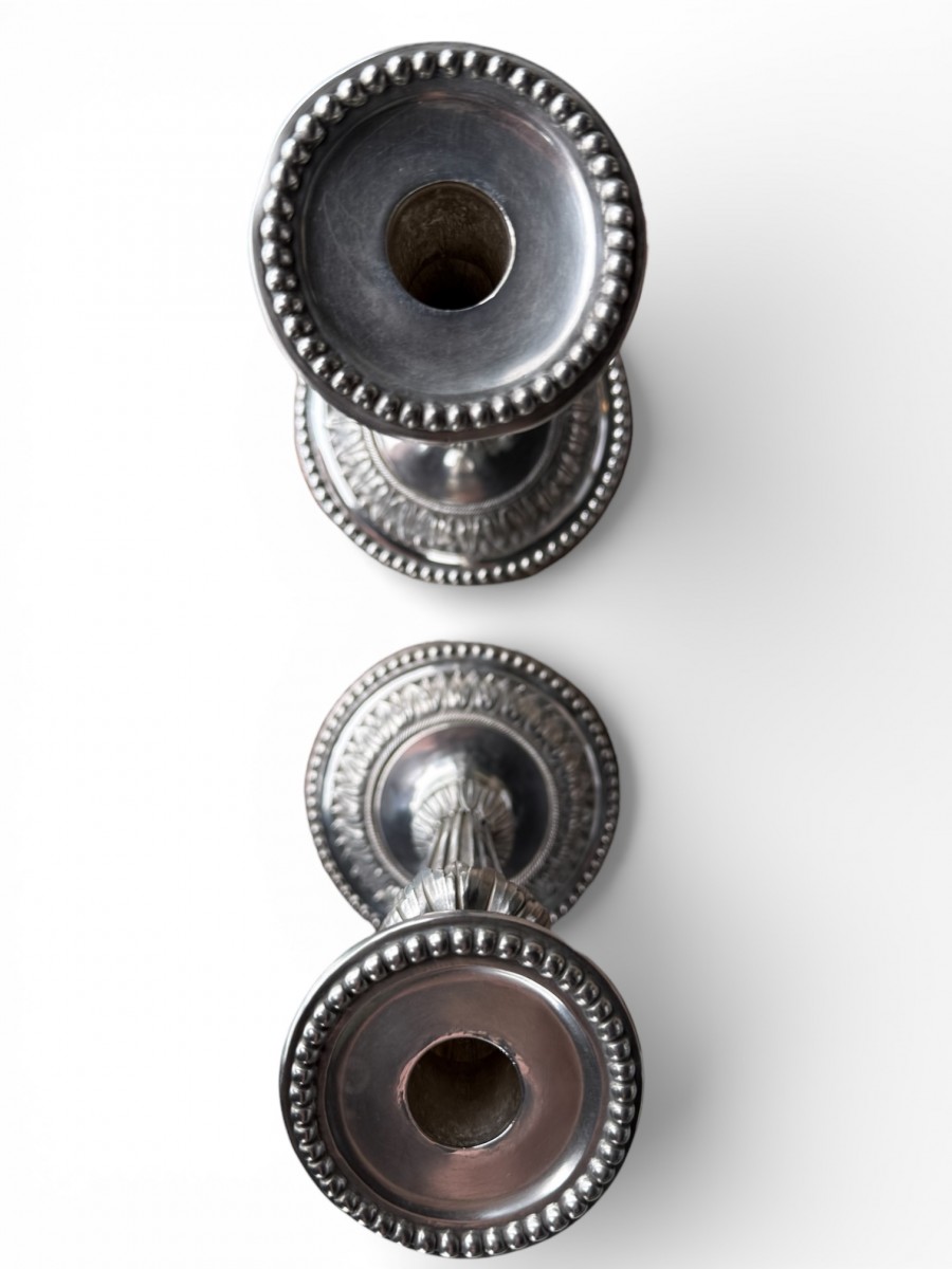 An important pair of solid silver candlesticks, made in 1782 by the silversmith Michel Verberckt, active in Antwerp at the end of the 18th century. These pieces are fully in keeping with the Louis XVI aesthetic, characterized by clean lines, symmetry, and antique-inspired decoration. Each candlestick rests on a stepped circular base, richly decorated with waterleaf friezes and a beaded rim, emblematic motifs of the Neoclassical vocabulary. The fluted stem rises elegantly, punctuated by gadrooned rings and a finely carved baluster knop. The circular socket, highlighted by a beaded molding, harmoniously completes the whole. The candlesticks bear 18th-century Antwerp hallmarks, including the maker's mark of Michel Verberckt, as well as the date 1782. 19th-century re-inspection marks are also present, attesting to a later official re-inspection, a common practice to guarantee the silver's purity during re-circulation or administrative changes. Their quality of execution, balanced proportions, and delicate decoration make these candlesticks a fine example of late Ancien Régime Antwerp silversmithing and attest to the high level of mastery achieved by Michel Verberckt during this period. Total weight (filled): 1.5 kg