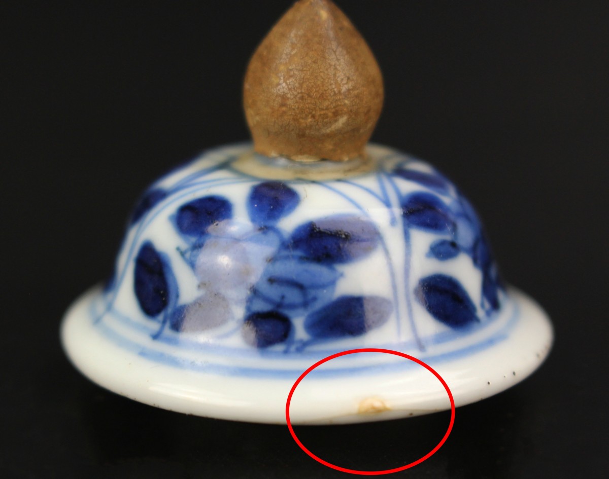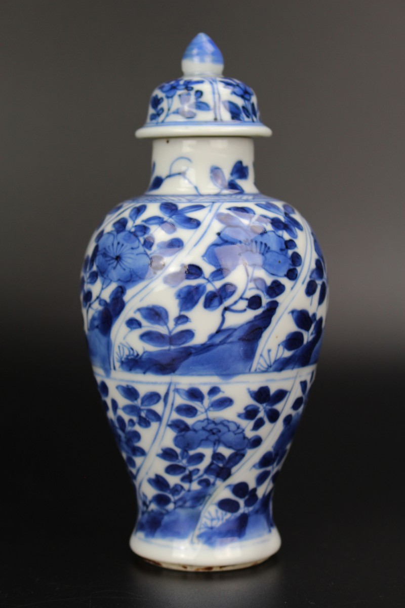- One of the lidded vases in pristine condition, the lid with a hairline on the side and a missing button - a brown wooden button of the same form has been installed in its place.