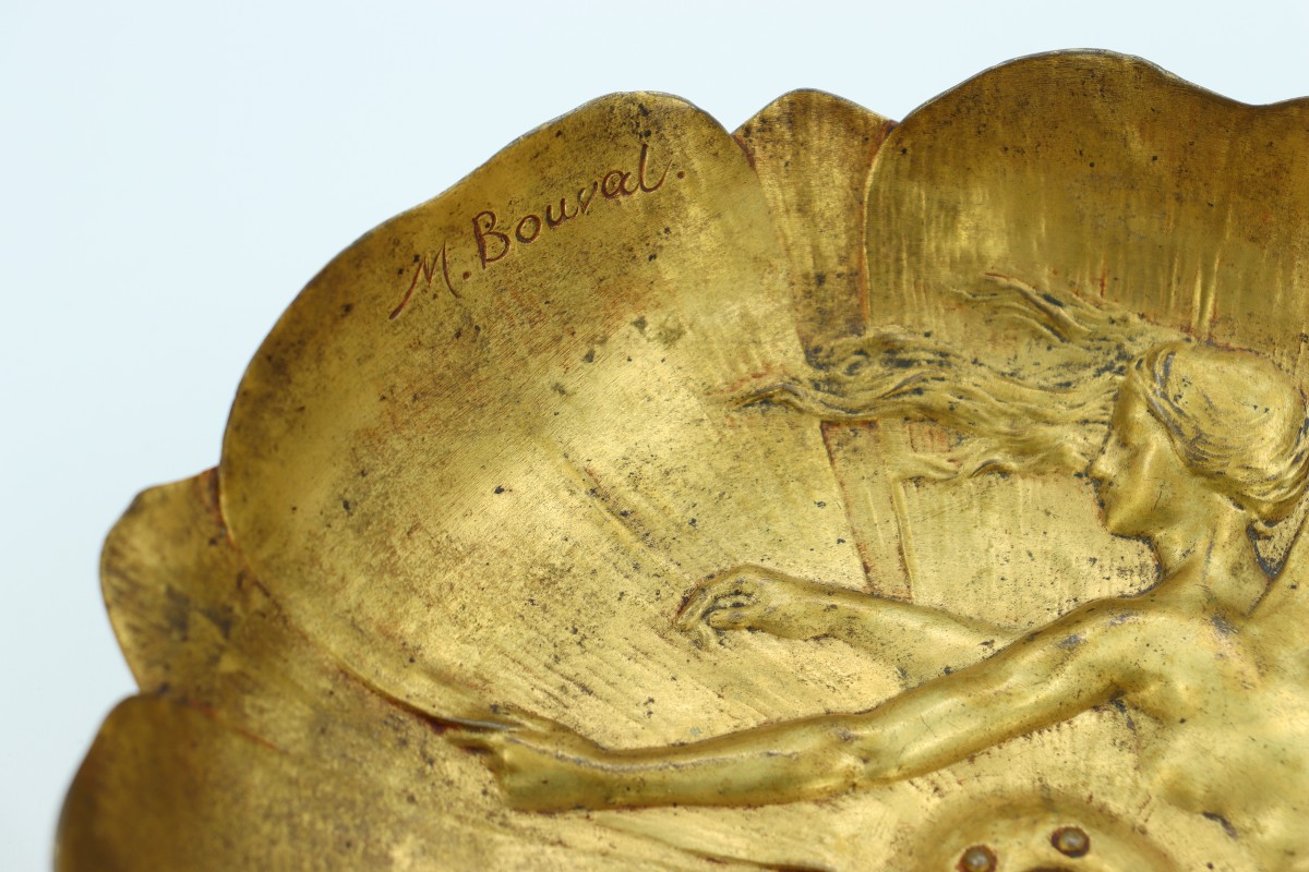 A student of Falguière, Maurice Bouval was a sculptor active between the 1880s and World War I. Renowned for his delicate bronzes and decorative objects, he was a member of the Société des Artistes Français and participated in the 1900 World's Fair. His work is characteristic of Art Nouveau, where the female figure and inspiration from nature occupy a central place.