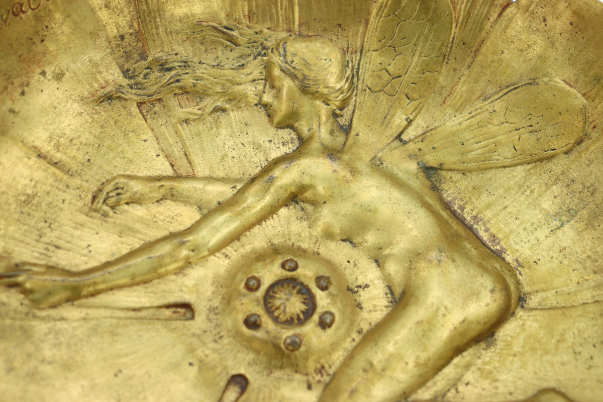 The work we are presenting, Coupe à la fée au nénuphar (Cup with Fairy and Water Lily), perfectly illustrates the artist's refinement and poetry. A delicately sculpted fairy in bas-relief rests in the heart of a water lily, whose stem serves as an elegant handle for the object. This cup combines harmony between aesthetics and functionality, perfectly embodying the spirit of Art Nouveau and the breaking down of barriers between the arts.