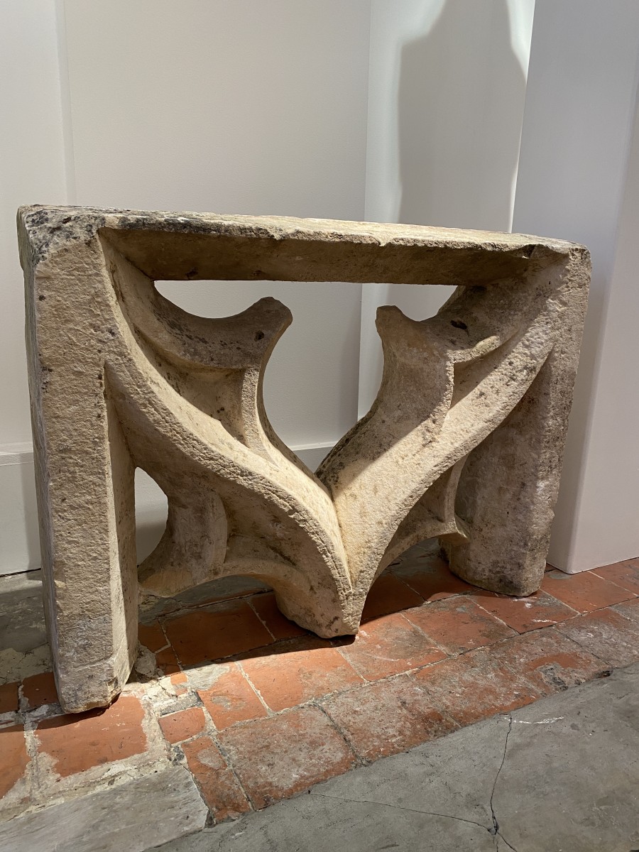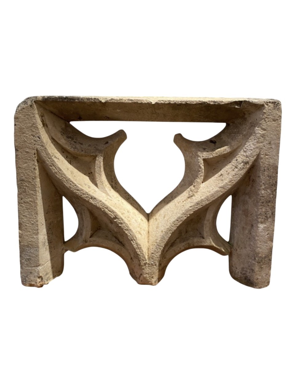 Superb gothic architectural element that was once a part of a balustrade in a castle, church or noble mansion. White limestone. Accompanied by its French export license ‘Certificat d’Exportation d’un Bien Culturel’ from the French ministry of culture. Dimensions: 51,5x68,5x20cm. Weathered, chipping, one restored crack (at 5 cm from the bottom of the left vertical foot). Extremely decorative. Weight: approximately 75 kg.