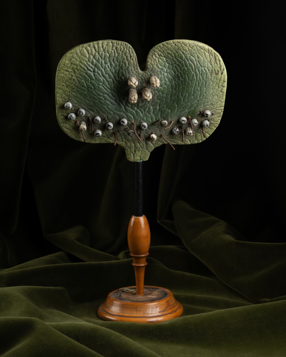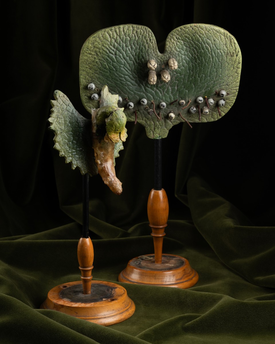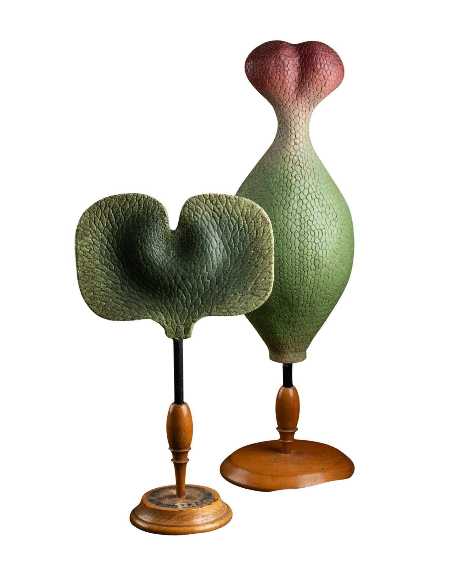 The two Brendel models date back from the very first series designed by Robert Brendel starting in 1866 in Breslau. Recognisable by their varnished sculpted bases characteristic of the firm's earliest models, they represent the prothalli — reproductive structures — of two fern varieties, Pteris serrulata and Aspidium filix-mas. The third model represents a section of an angiosperm pistil. It is of more recent conception and can be attributed to the firm Phywe Aktiengesellschaft which, after purchasing the rights and patterns of the Brendel collection following the latter's cessation of activity, continued to produce botanical models based on Brendel's designs in the immediate post-war period.