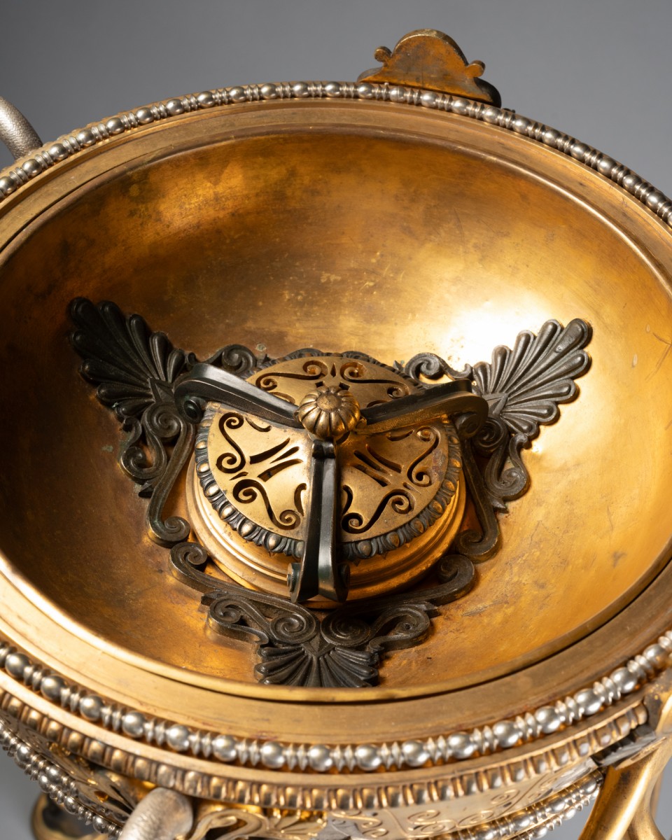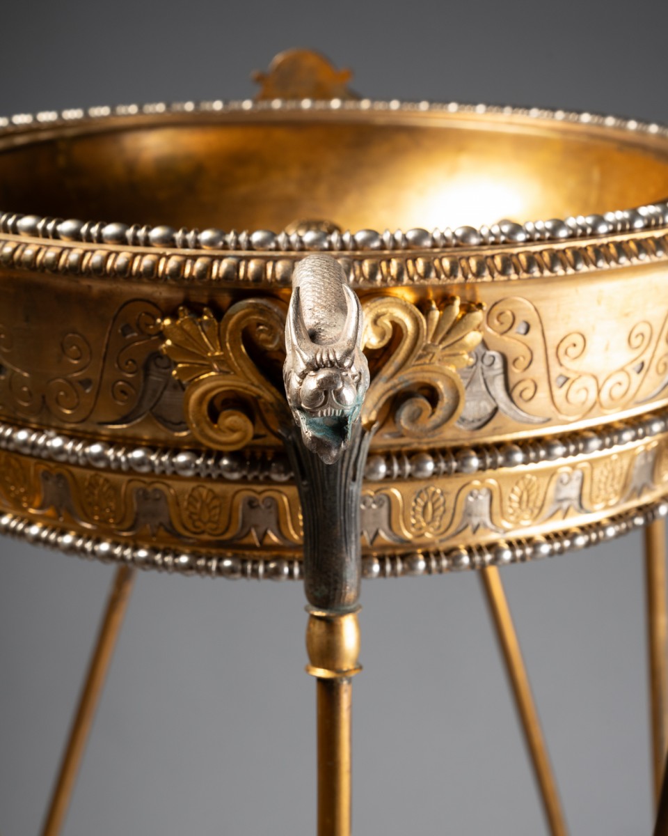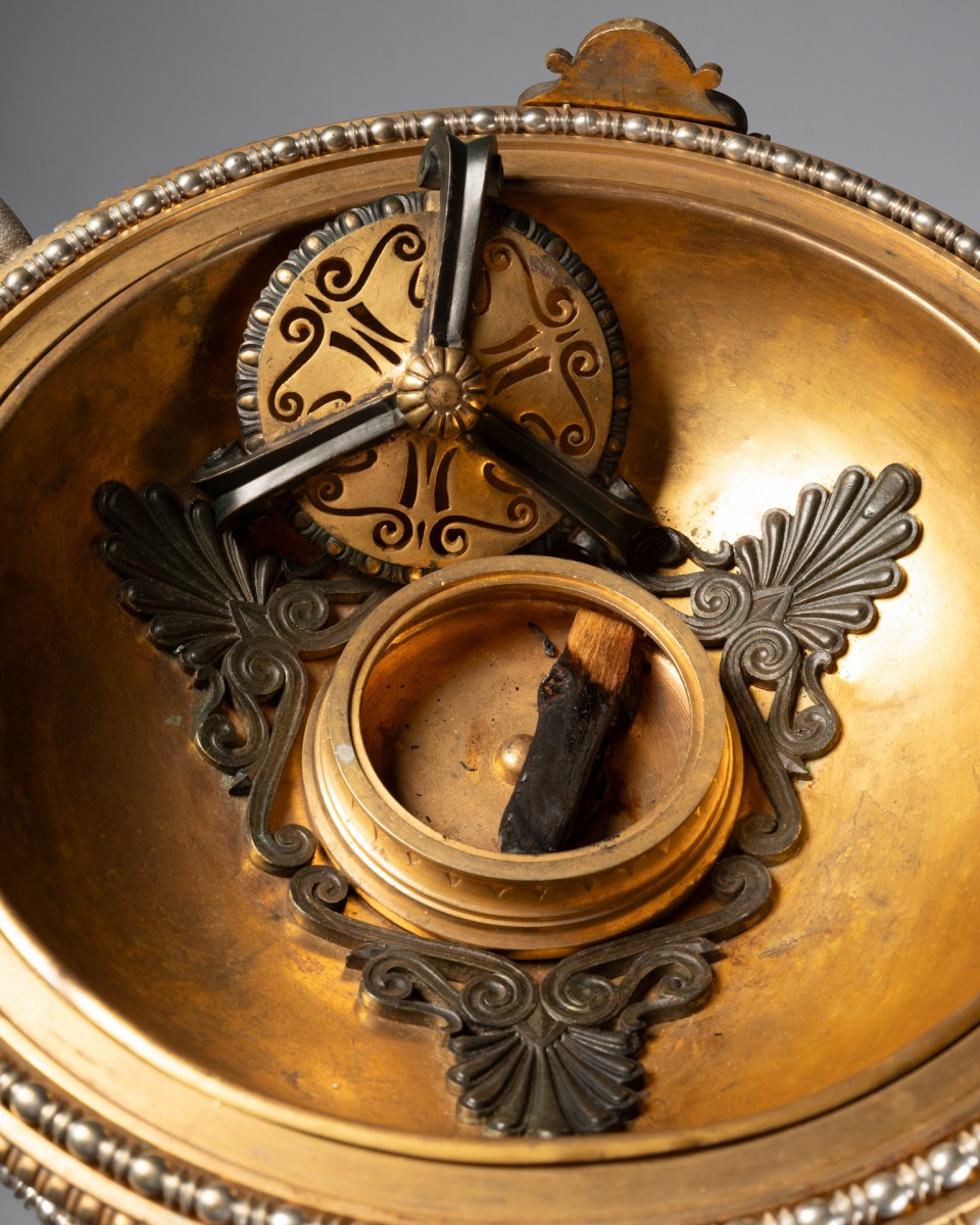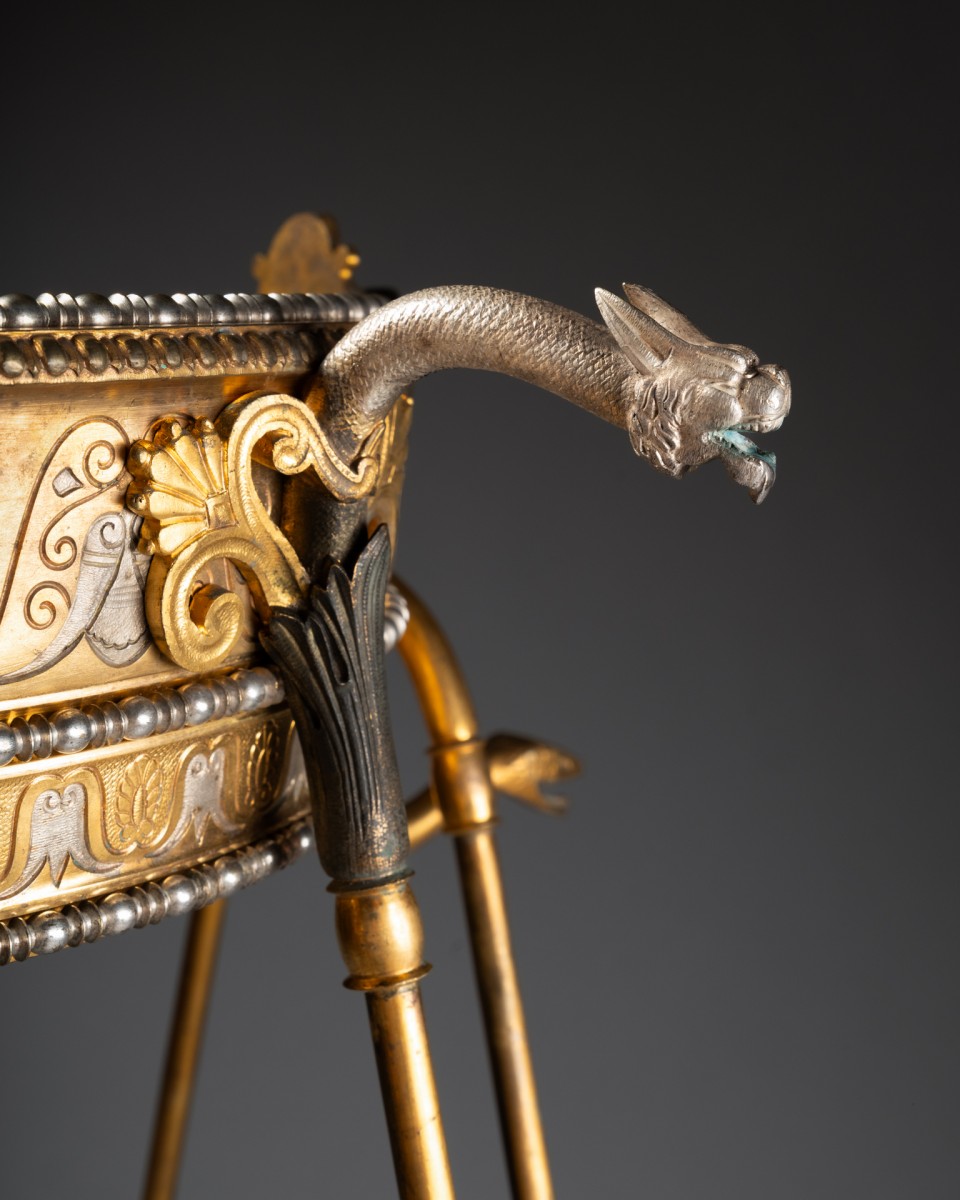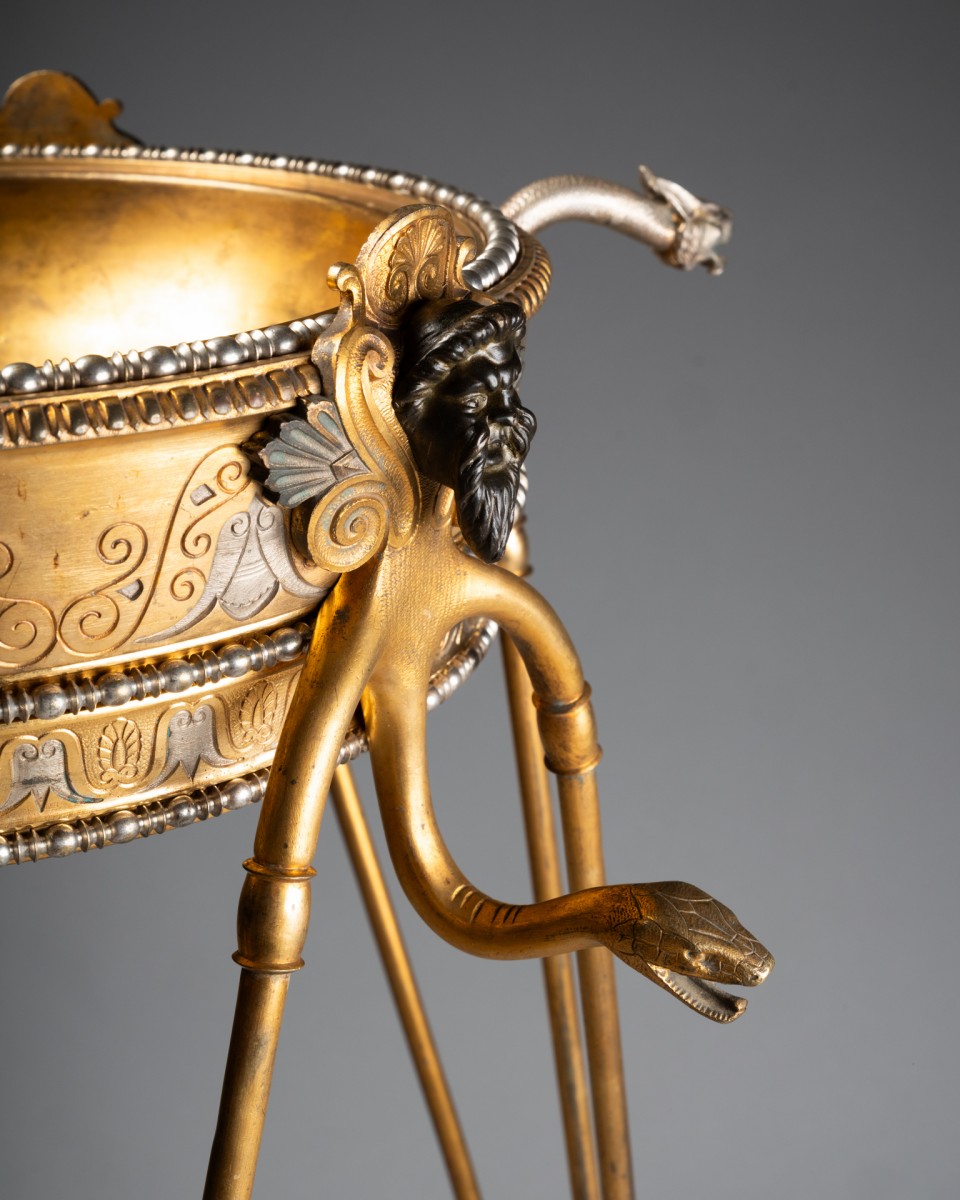 By its quality of cast iron, the precision of the chisel and the sophistication of the patinas, this tripod can be compared to the neo-ancient productions of major Parisian houses and workshops such as Barbedienne, Christofle, Reiber or Ferdinand Levillain, which developed in the years 1860-1900 perfume burners, candelabras and vases of ancient inspiration, often presented at the Universal Exhibitions.