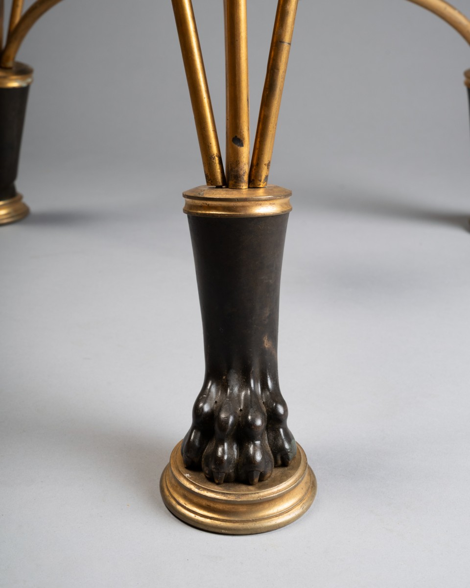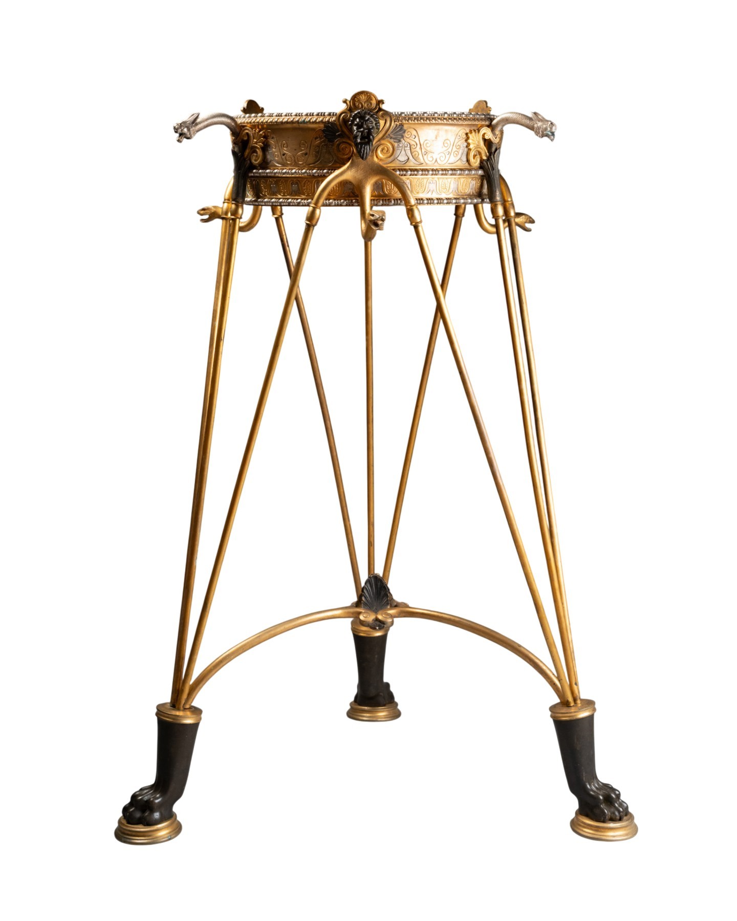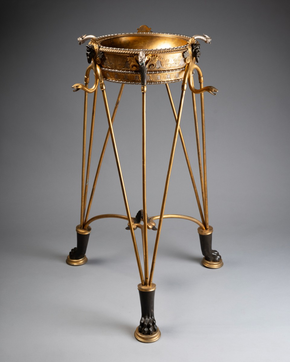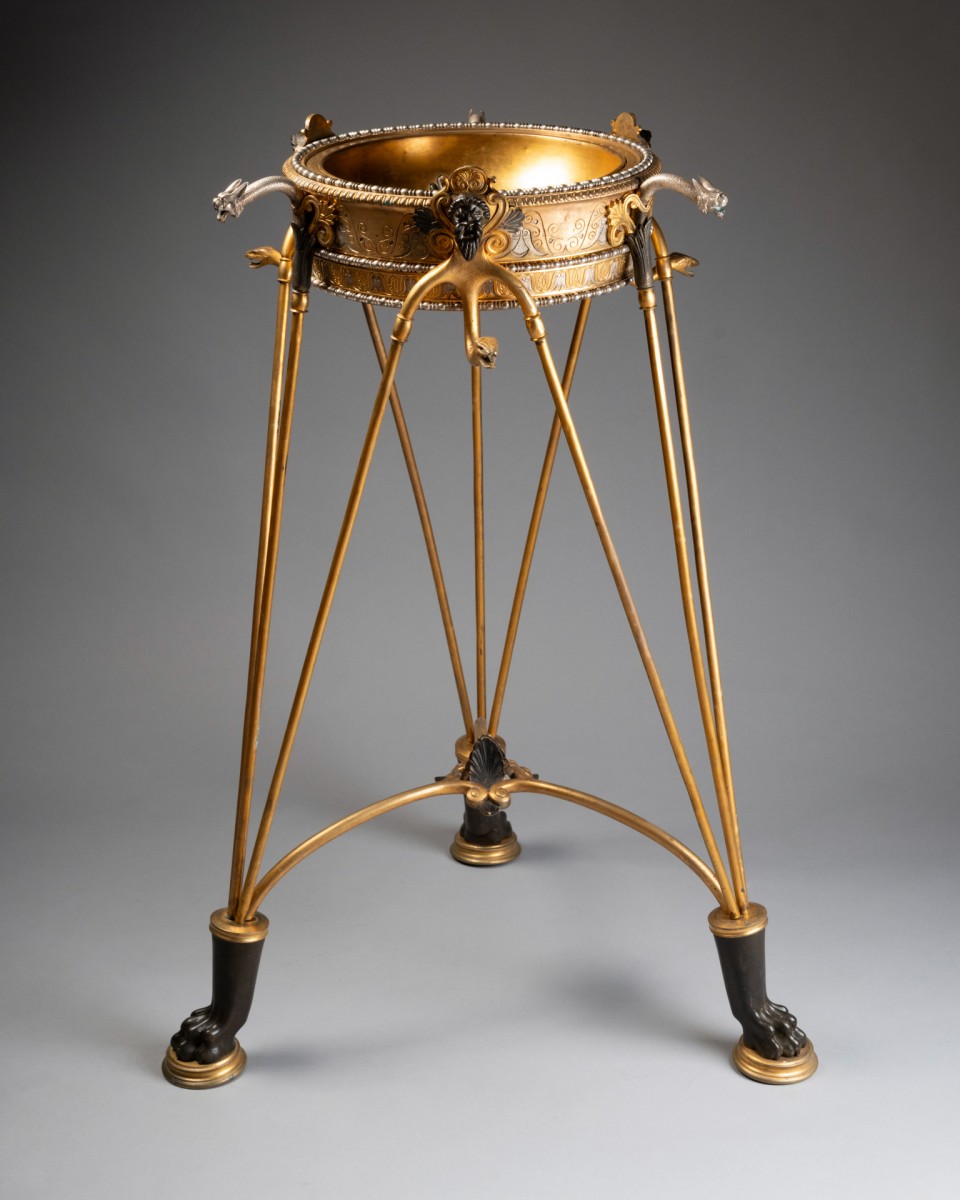 By its quality of cast iron, the precision of the chisel and the sophistication of the patinas, this tripod can be compared to the neo-ancient productions of major Parisian houses and workshops such as Barbedienne, Christofle, Reiber or Ferdinand Levillain, which developed in the years 1860-1900 perfume burners, candelabras and vases of ancient inspiration, often presented at the Universal Exhibitions.