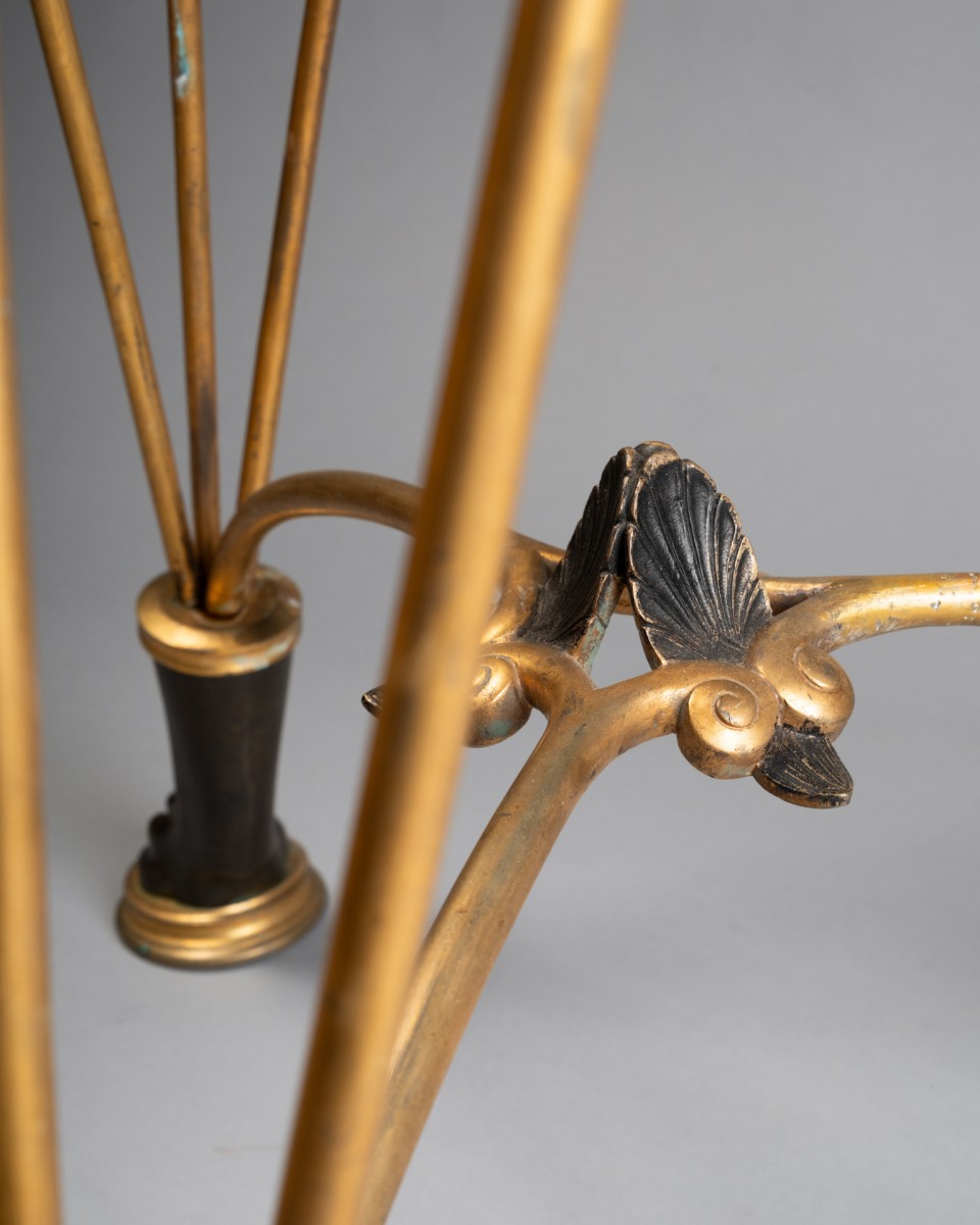 Framed bronze fire-perfume tripod, resting on three slender uprights joined by a circular spacer. The upper container, of flared circular shape, is underlined by molded friezes and rinses of ancient inspiration.