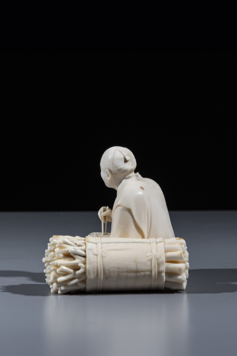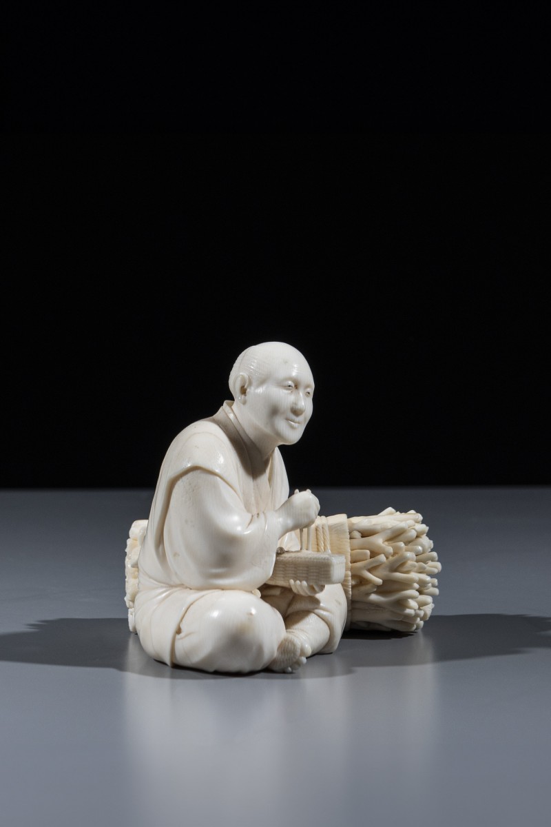 An ivory okimono of the Tokyo school, depicting a woodcutter seated during a moment of rest, holding a bento box and chopsticks in his hands.