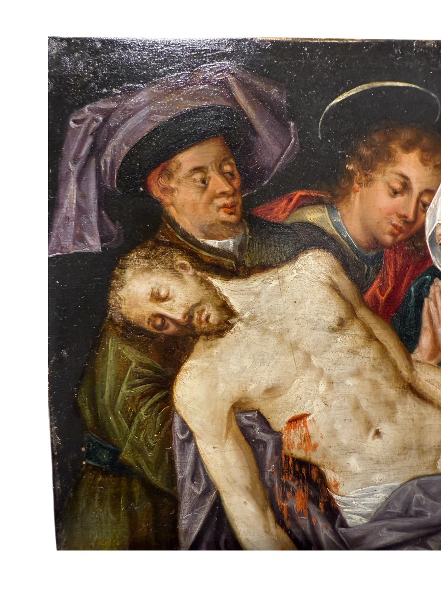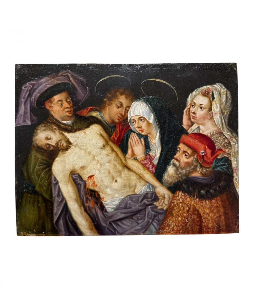 Technical description: The painting is executed on a hand-hammered copper plate, approximately 1 mm thick, with characteristic tool marks on the reverse. The presence of a reddish-brown preparatory layer of red lead, located between the metal support and the paint layer, confirms a pre-1605 production typical of Antwerp workshops. The application of pigments is extremely fine, consisting of translucent glazes on a smooth metal support, creating a precious, almost enamel-like surface. The overall state of preservation is very good, with a uniformly aged varnish and no visible overpainting. Iconography and composition: The work depicts the Lamentation of Christ, a devotional subject emblematic of the late Renaissance and early Baroque periods. The dead Christ is supported by Nicodemus and Saint John, while the Virgin, flanked by Mary Magdalene and Joseph of Arimathea, expresses a sorrow contained in prayer. The composition retains the symmetrical calm of Renaissance prototypes, while the emotional sensitivity and chromatic richness foreshadow the Baroque. Particular attention is paid to the refined rendering of textiles, metalwork, and jewelry—distinctive hallmarks of Antwerp Mannerist craftsmanship.
