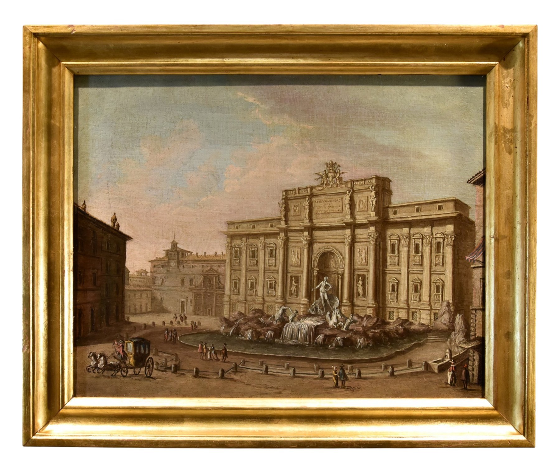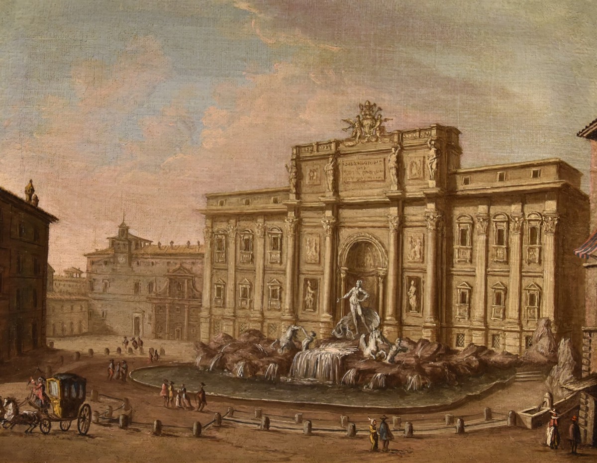 This splendid view of Rome, depicting the famous Trevi Fountain with Palazzo Poli behind it, is of excellent quality and is attributed to the Roman landscape painter Giovanni Giacomo Van Lint (Rome 1723 - 1790). It is the largest of the famous fountains in the Eternal City, located in the square of the same name, offering a picturesque view at the intersection of the narrow streets of the historic centre.