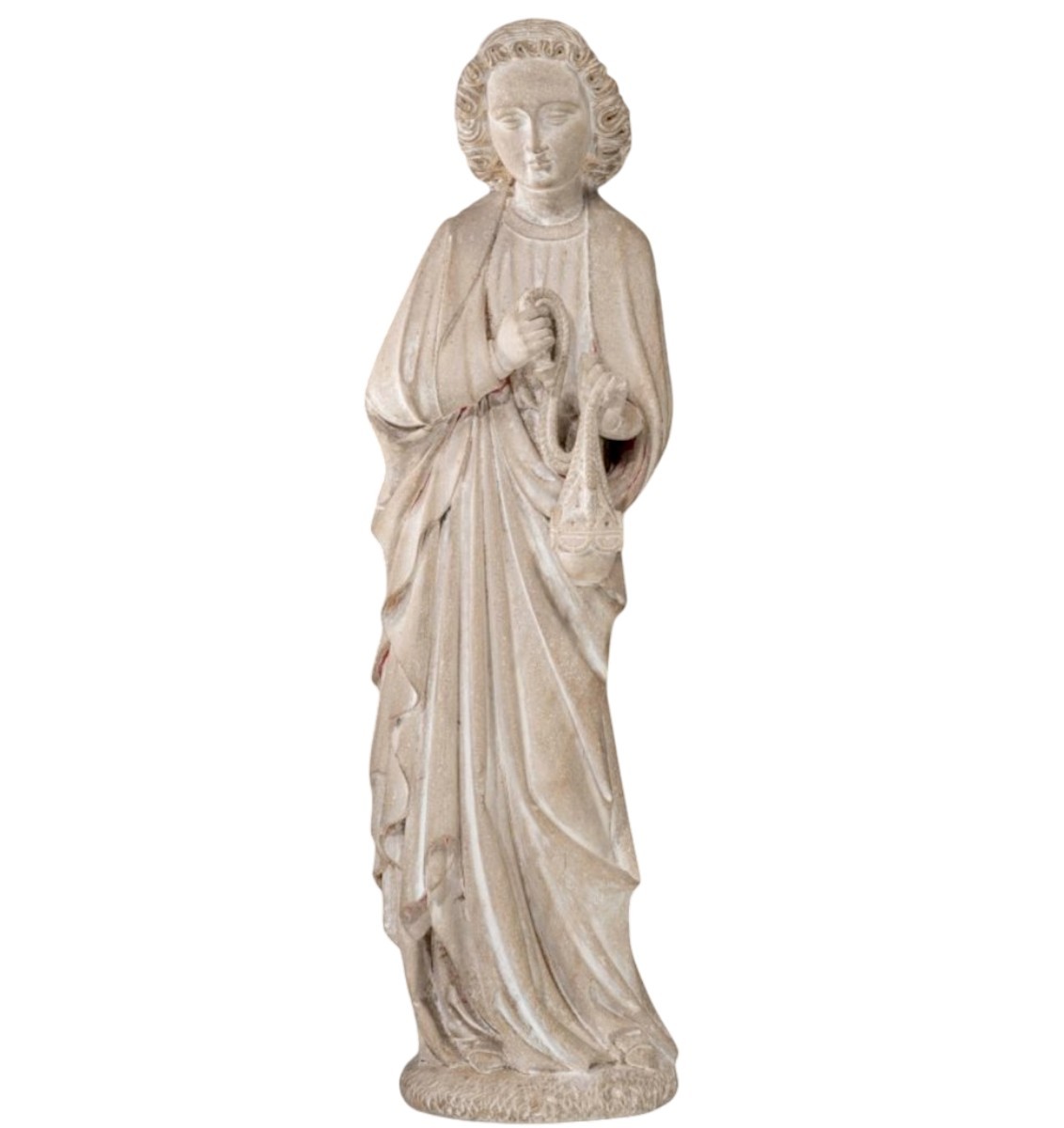 In the still outstanding section on the specific art-historical classification of this present sculpture, reference should be made in advance to the “Angels of Poissy”, which, according to the arguments of Béatrice de Chaucet-Bardelot and Jean René Gaborit (see the catalog in book form for the exhibition “L’Art au temps des Rois Maudits – Philippe-le-Bel et ses fils, 1285-1328”, Paris, Grand Palais 1998, no. 42 A-G, pp. 89 ff.) most likely belonged either to an ensemble depiction of a “Last Judgement” or a “Coronation of Mary” on one of the former transept portals, but most likely to the portal of St. Louis of the royal priory church of Poissy: Apart from the fact that these usually also have chiseled wings and consistently contain attributes of the Passion of Christ (=Arma Christi) and can therefore be ruled out as figures for a genuine context for a “funerary” dedication, the representation in question of the present wingless youth figure (in fact, there is not the slightest trace of a possibly imaginable assembly of either wings carved in wood or worked in metal) with the striking reproduction of a tower rib in complete reproduction of its authentic, The striking depiction of a tower tribune in complete reproduction of its authentic, then contemporary appearance thus also fulfills the iconographic aspect apostrophized by the two aforementioned authors – Chaucet-Bardelot and Gaborit – according to which such depictions with liturgical devices could indeed be causally related either to funerary dedications or to those on ciboria-like altar canopies. Since this sculpture obviously never had angel wings, it can therefore hardly be interpreted as an “angel” figure, but rather as a young man serving in a liturgical action and thus to be assigned to the personal milieu of an altar boy.