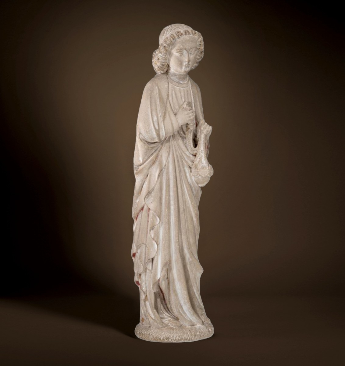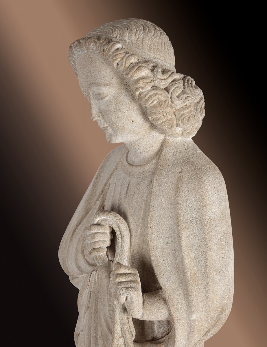 The comparatively named sculptures are – almost unanimously – dated to the ninth decade of the 13th century. However, the fact that the present sculpture is “distant” from these works in terms of its developmental history does not a priori imply that it was created at a different time; rather, this circumstance can be explained by a more far-reaching ensemble of influences in the extended circle of the “Ile-de-France” in the last quarter of the 13th century, which is why it is conceivable that this sculpture was created around 1285. The sculpture in question is a striking example of how the development of sculptural creation in the Ile-de-France from the elongated figure of Virtue from the ensemble of the Descent from the Cross (Paris, Louvre, see Danielle Gaborit-Chopin, in the catalog in book form for the exhibition “L’Art au temps des Rois Maudits, Philippe-le-Bel et ses fils, 1285-1328”, Paris Grand Palais 1998, no. 83, pp. 143 f.) to the “robe and body figure” of the early 14th-century sculpture of Saint Magdalene (item,Francoise Baron, no. 54, pp. 107 f.), which respects the body’s volumes despite its slender proportions.) by Écouis, whose “robe” consists of grooved strands of large-lined hair that completely cover the entire body (except for the feet, the folded hands and the face) and is thus characterized by large-curved ornamental linéament. It is precisely this splendor of hair, which “envelops” almost the entire body, that also conveys the plastic consistency of the body of this Magdalene sculpture in its ornamental course. The examples thus cited as antipodes of the style-oriented development – the aforementioned Descent from the Cross of 1270 in the Louvre and the Magdalene of Ècouis – confirm the dating of the liturgical youth sculpture presented in this vote to around 1285!