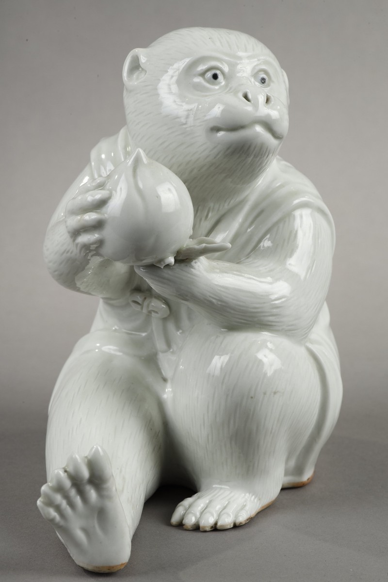 Representing a monkey holding a longevity peach and a tiger raising its paw Japan Hirado 19th century