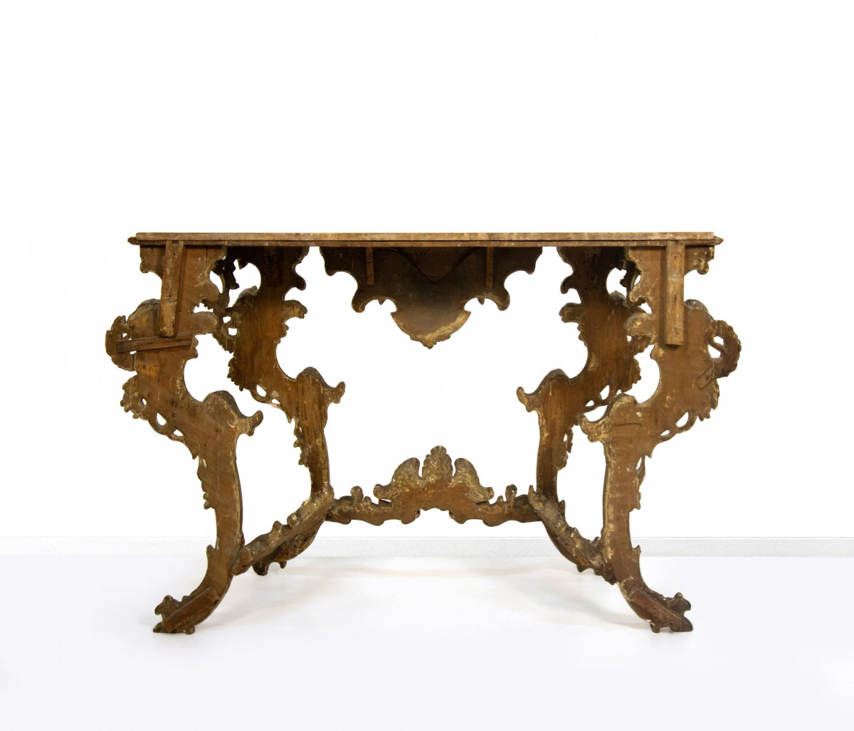 A carved and gilded wooden console table, 18th century. The waist is adorned with a high, shaped band centered by a mask between volutes. The strongly shaped legs are carved with monopodal winged herms, decorated with flowering and leafy branches and connected by an X-shaped crosspiece centering a leafy element between two volutes. Shaped marble top (not from the period), 85x144x50 cm.