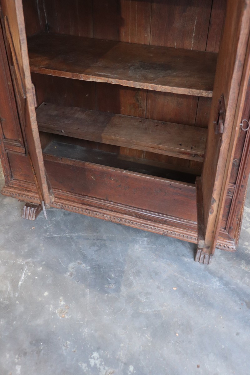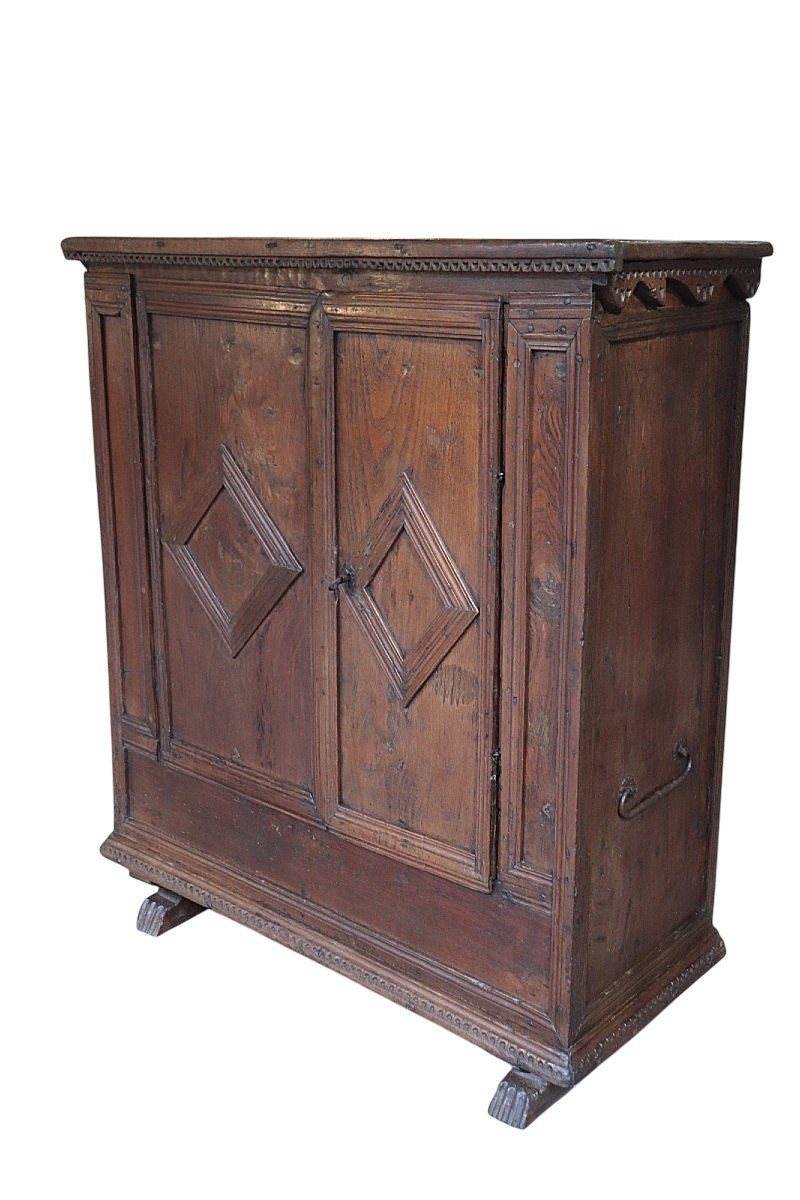 Chest-sideboard in chestnut wood with side handles, internal shelves and secret compartment in the bottom shelf. Very sturdy piece with beautiful patina. The top is in Patina. Period: 17th century Origin: Spain Dimensions: Height 140 cm, width 117 cm, depth 50 cm