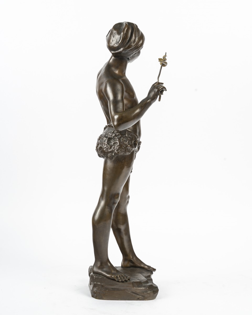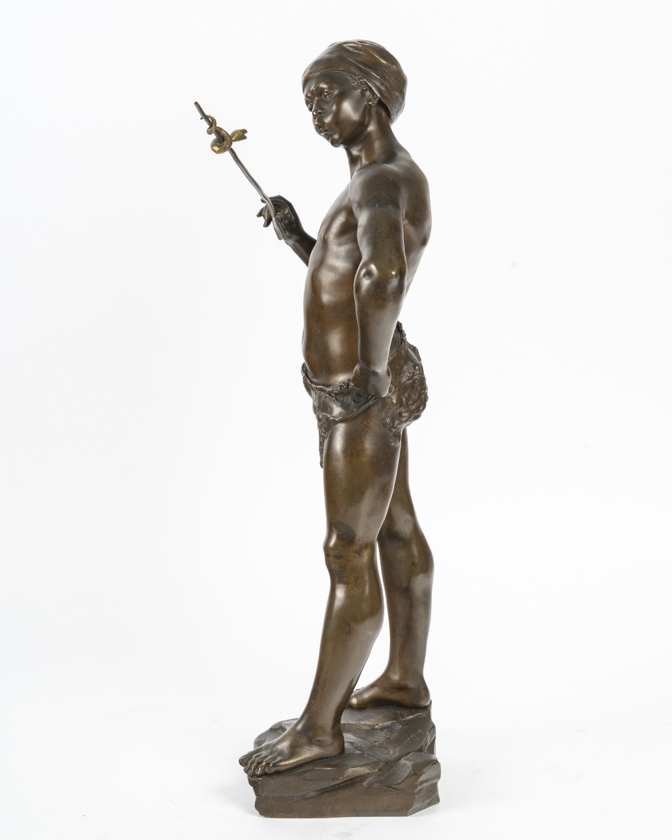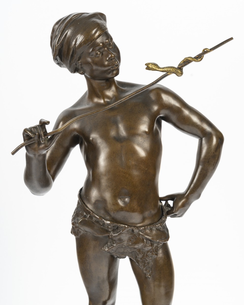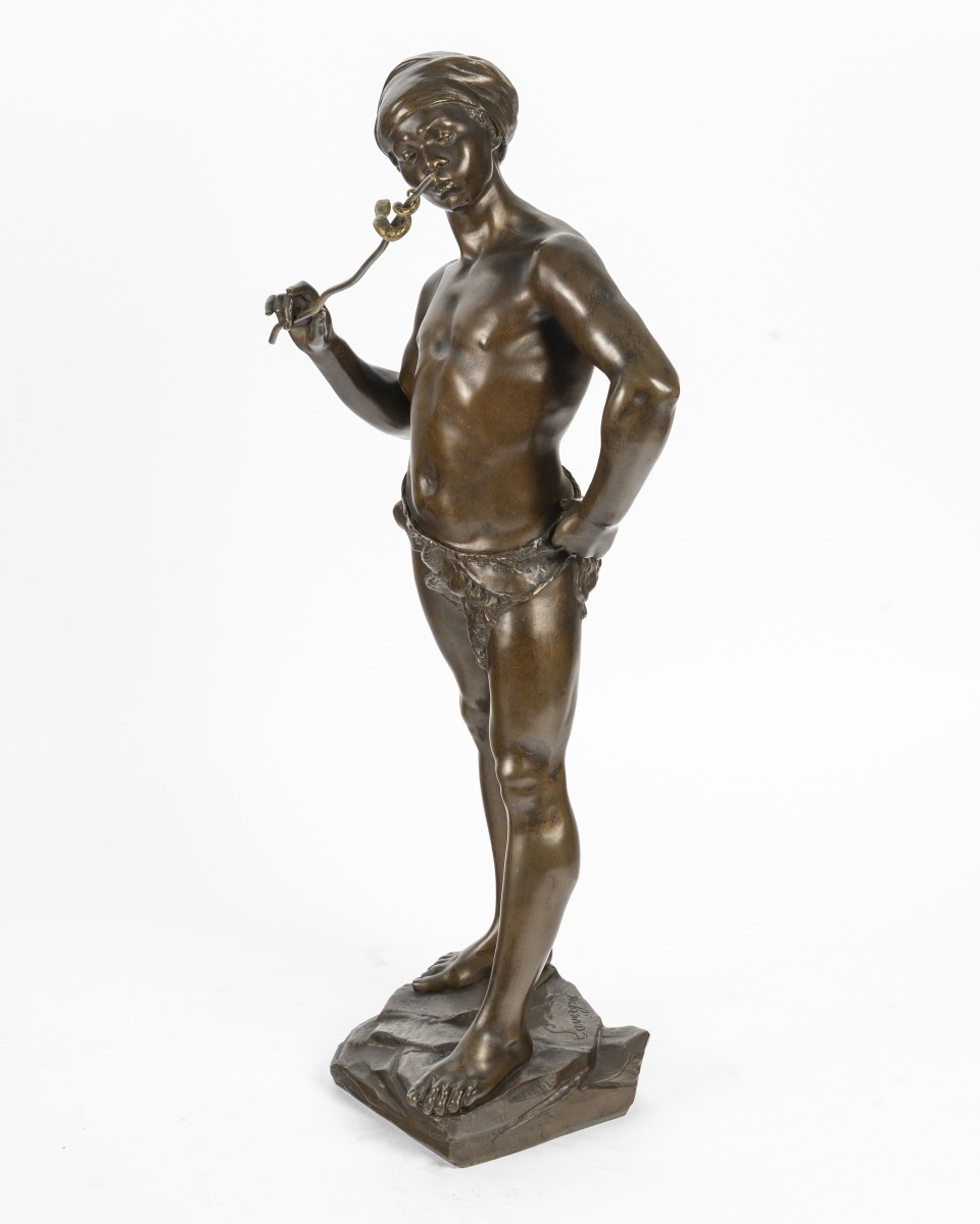 The Snake Charmer is an emblematic sculpture reflecting the late 19th-century taste for exoticism and Orientalism. Through a slender and perfectly sculpted male figure, Adolphe Jean Lavergne combines academic elegance, sensuality, and a sense of movement.