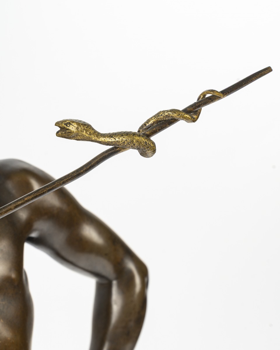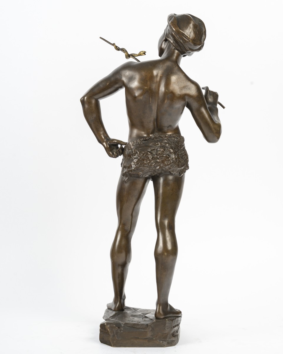 The figure, captured in a suspended moment, converses with the snake coiled around his flute, evoking both music and the mastery and fascination of man over the animal. The precise modeling, balanced anatomy, and subtle tension of the pose testify to the sculptor's high level of technical skill.