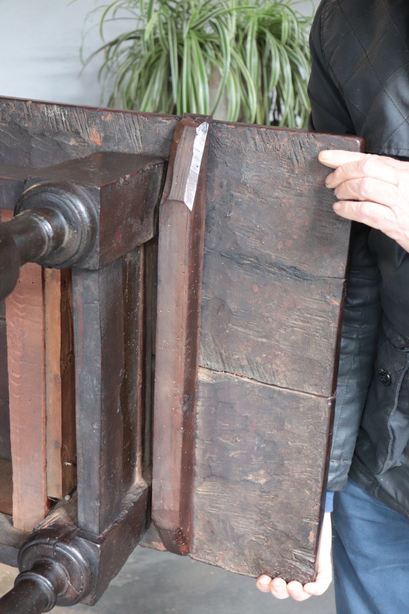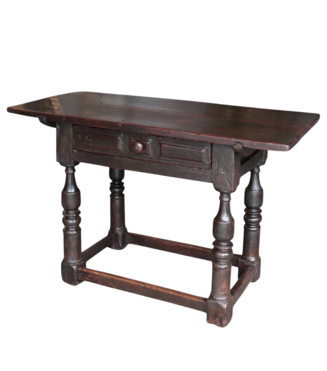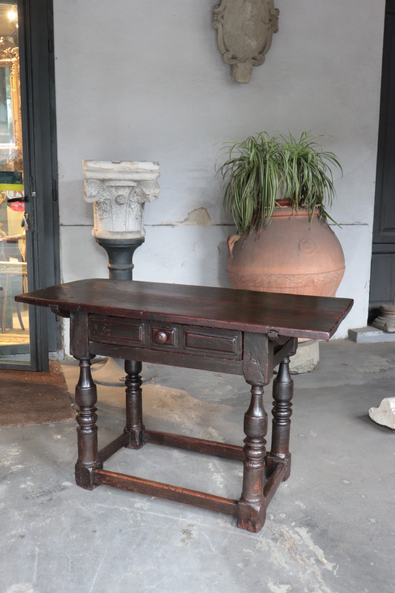 Spindle-legged table, Bologna, early 17th century Beautiful walnut table with spindle legs, crossbars, and central drawer. Excellent condition. Original patina. Very stable and solid. Period: early 17th century Provenance: Bologna Dimensions: L120W56xH77