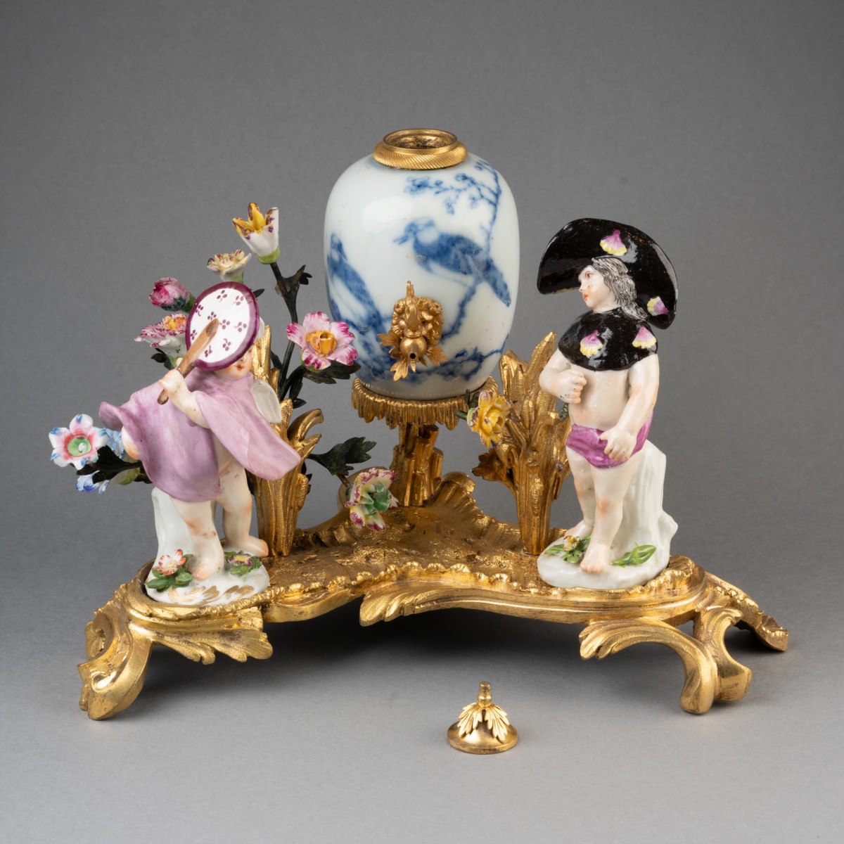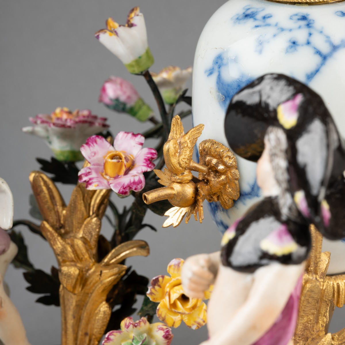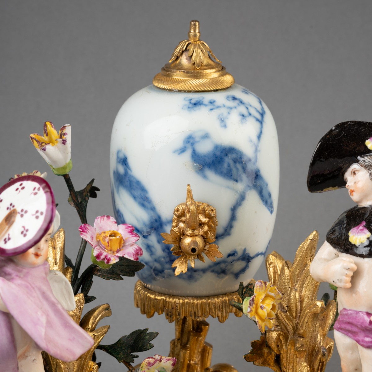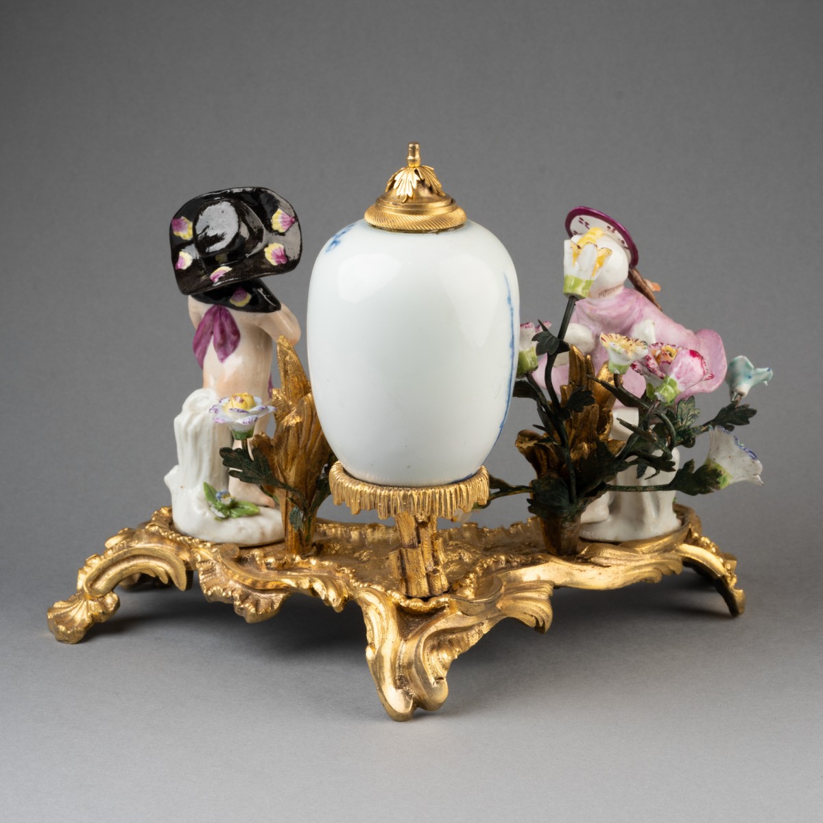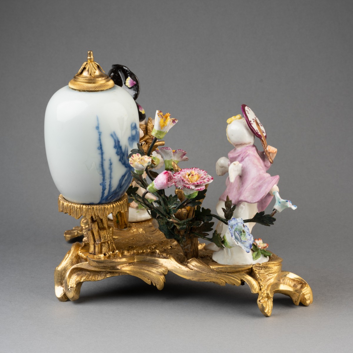 Small Chinese porcelain vase mounted as a perfume fountain, resting on a finely chiseled and gilded bronze Rocaille terrace, holding two Meissen porcelain figures acting out a scene. The terrace is also decorated with two large gilded bronze bouquets holding Meissen porcelain flowers. Minor porcelain restoration. 18th-century work.