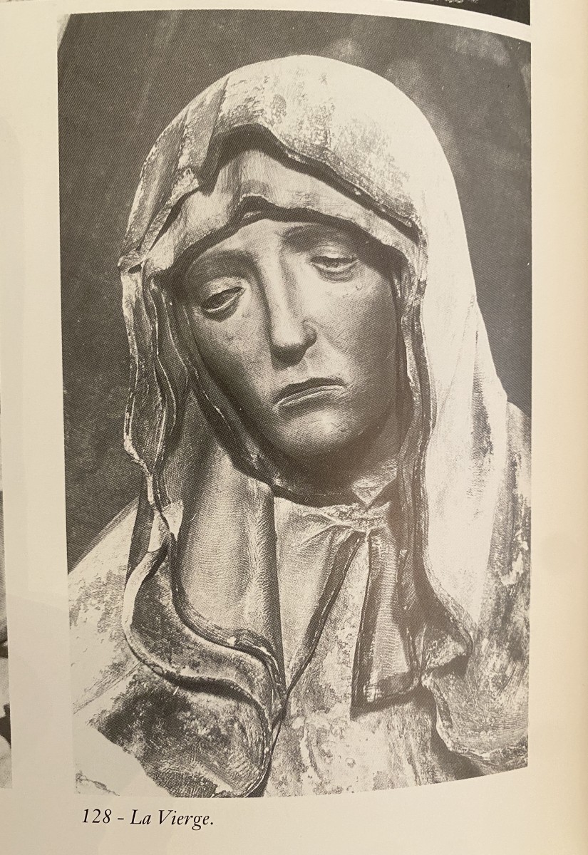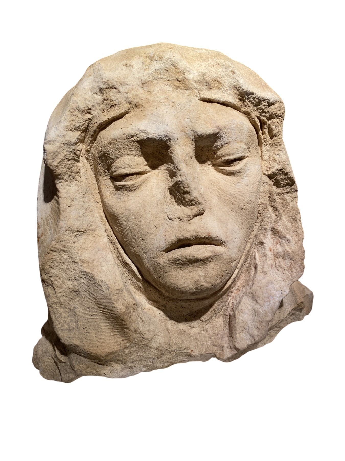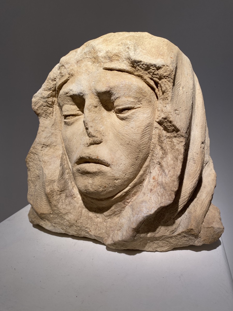 The physiognomy of Jacqueline de Laignes, who donated the Sepulchre of Chaource with her husband, also shares common features with our face: the same oval shape contained within a wimple, the same sad yet restrained expression.