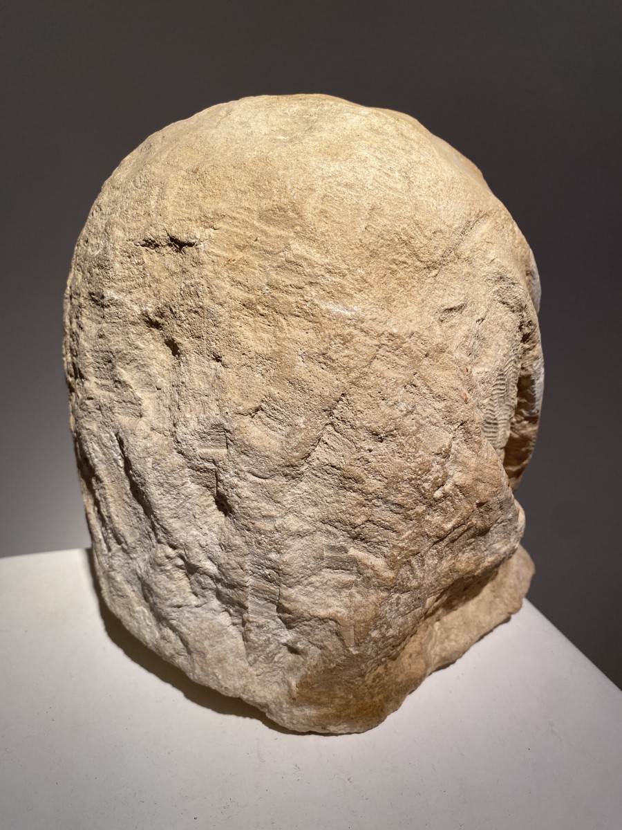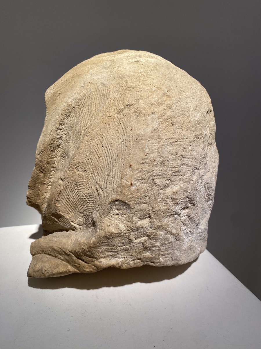 This is a limestone head of a woman whose face is enclosed in a wimple, precisely defining her features and highlighting them. The wimple is topped by a veil, only the outlines of which can be distinguished due to missing material. The oval shape of the face, emphasized by the fabric, has severe features marked by grief but very restrained: elongated, half-closed eyes topped by furrowed brows, a slightly open, arched mouth emphasizing bitterness, prominent cheekbones and a strong nose - although damaged.