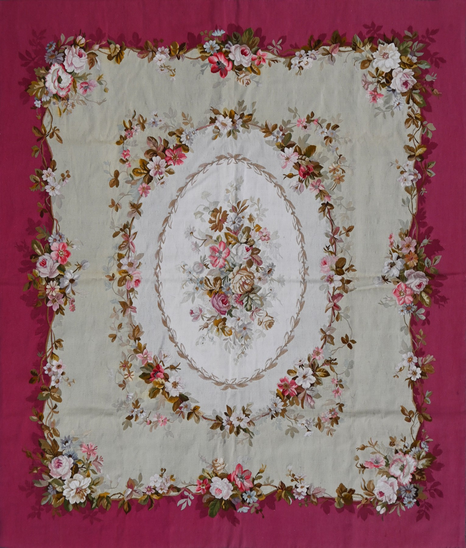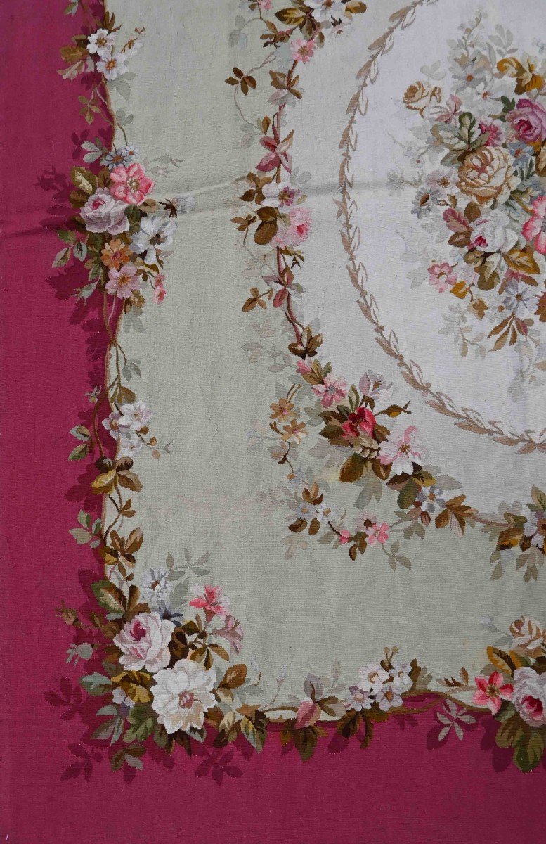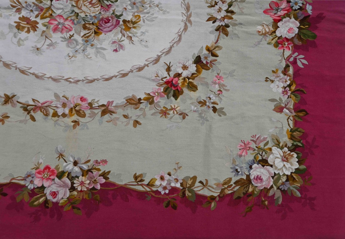 The Napoleon III rug from the Aubusson Manufactory, dating from the 19th century, perfectly illustrates the eclectic and refined taste of the era. These rugs, handwoven in the renowned Aubusson region, are characterized by abundant floral motifs, elegant arabesques, and decorative borders inspired by the Renaissance, Louis XVI, and Italian Renaissance styles. They reflect the exceptional craftsmanship of French workshops, with rich colors and exquisite design, intended to adorn the bourgeois and aristocratic interiors during the reign of Napoleon III.