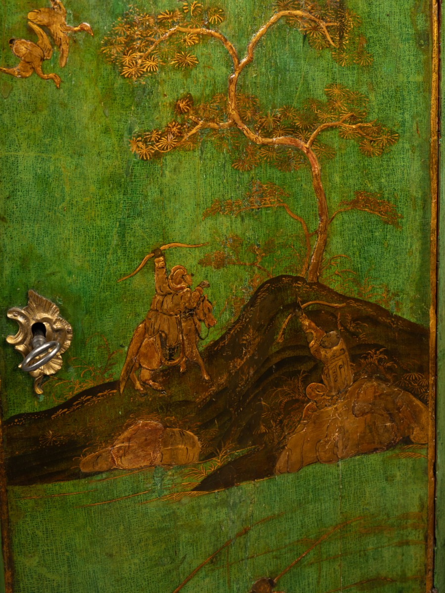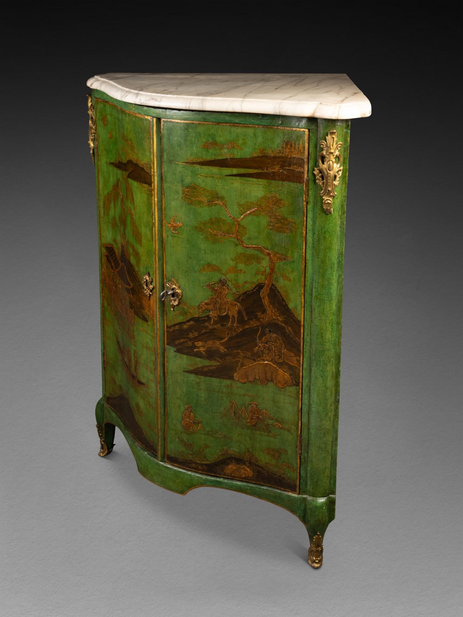 While a few small objects with a green ground were produced by Parisian varnishers, this is not the case for furniture, which is extremely rare.