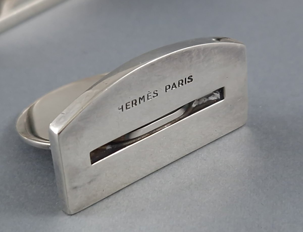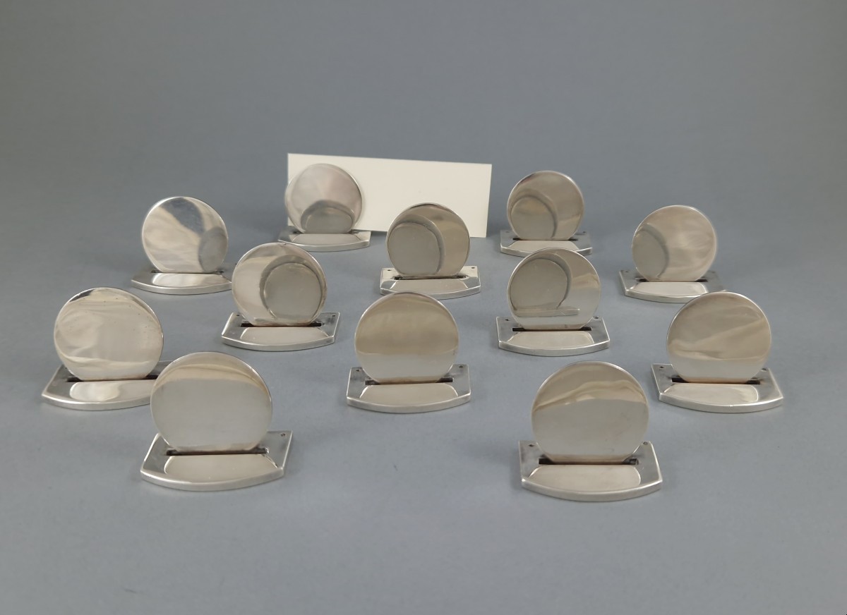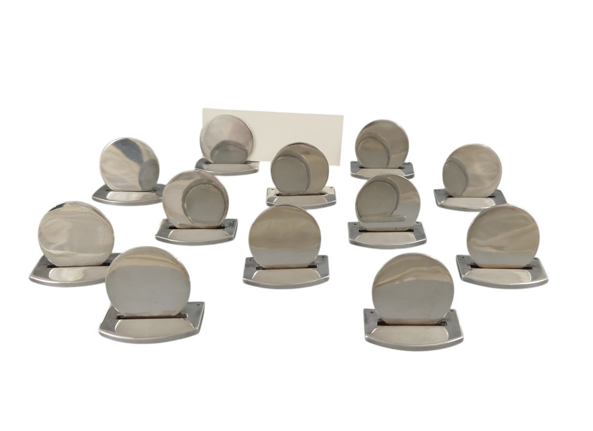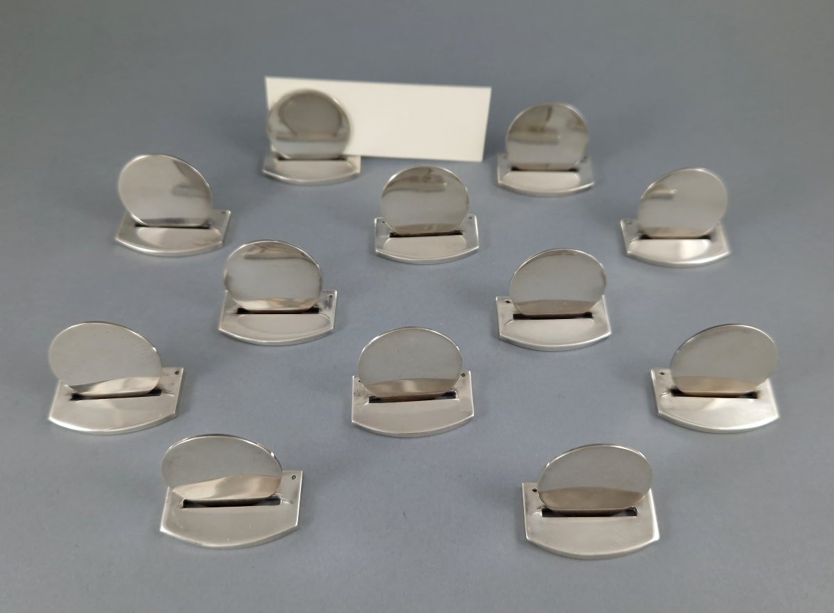 Set of twelve Sterling Silver place card holders by Hermès French silver hallmark (crab) Signed Length: 3.5 cm Width: 2 cm Height: 2.9 cm Weight: 352 grams