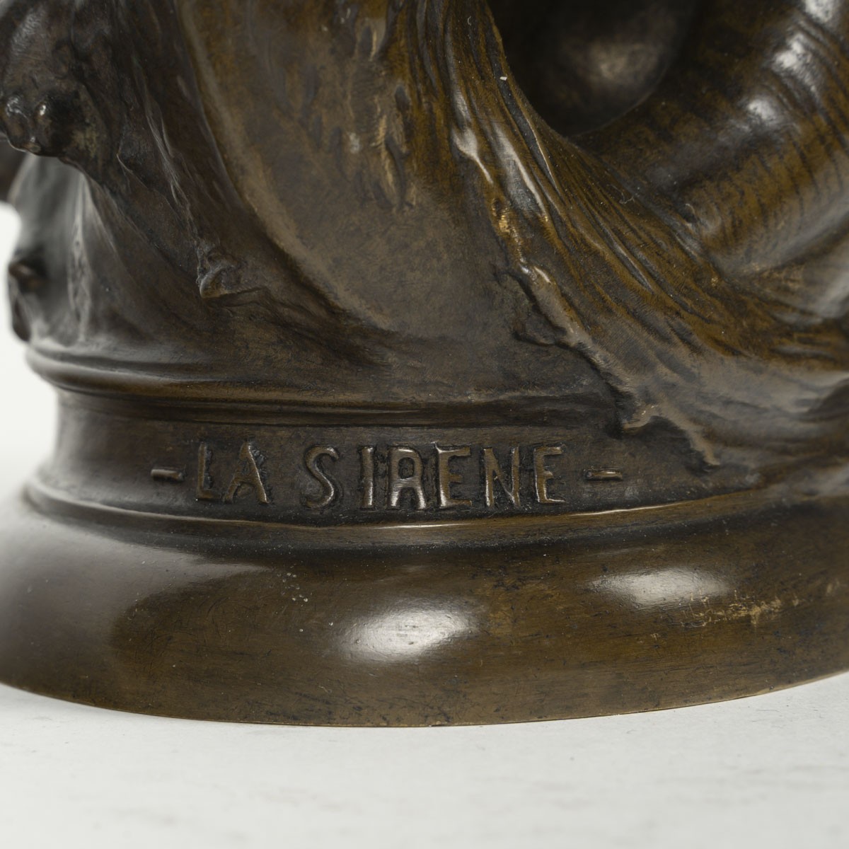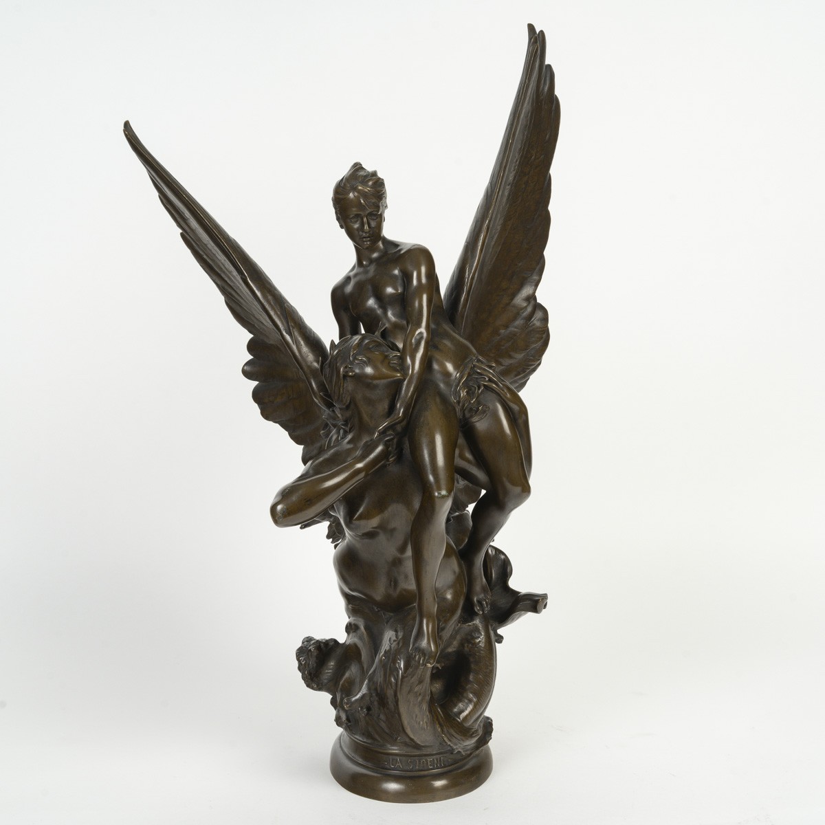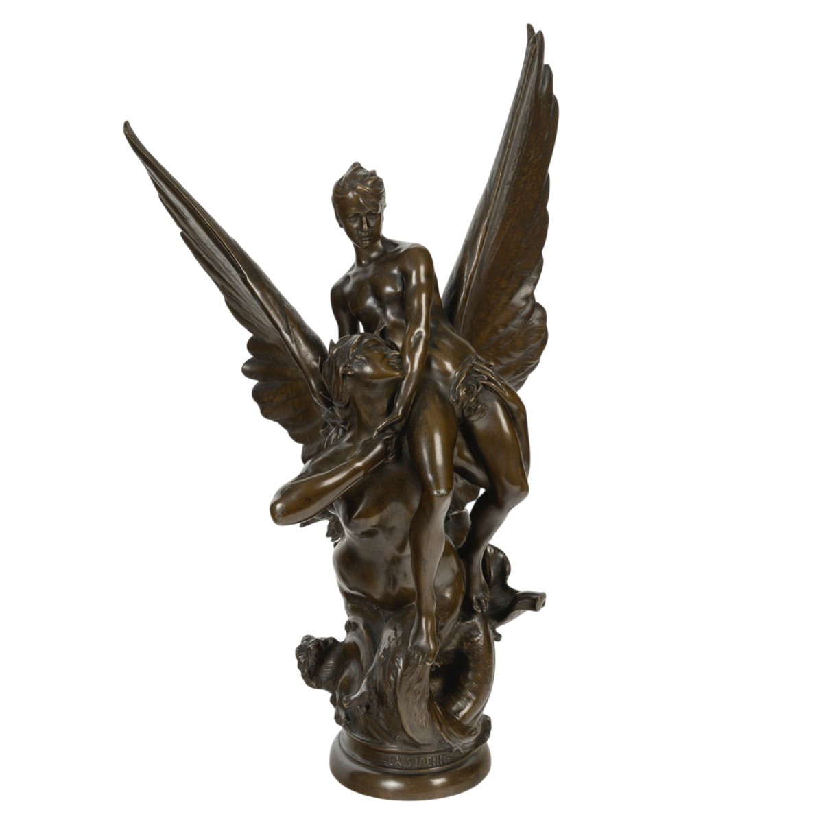 Group representing the abduction of a young man by a siren (a love allegory) imagined and sculpted by Denys Puech during his stay in Rome at the Villa Medici between 1887 and 1889. The base of the bronze bears the sculptor's name, the place of creation: Rome, and the stamp of the founder Ferdinand Barbedienne, Paris. The medallion patina is original and the whole is in very good condition. Sent to Paris, this sculpture earned him a first-class medal at the 1890 Salon des Artistes Français. The same marble model is now on display at the Musée d'Orsay, and a second copy is also on display at the Musée Denys Puech in Rodez.