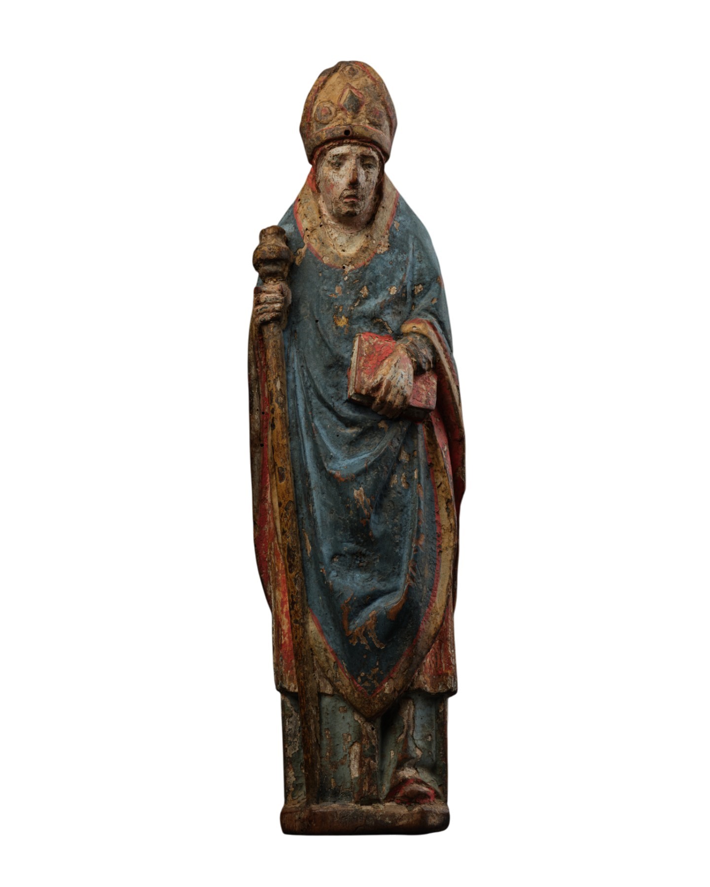 This polychrome linden wood statuette, a material favored by Swabian sculptors for its lightness and finesse, depicts a bishop with his episcopal attributes. He stands upright, dressed in his dalmatic, holding his crozier in his right hand, while his left hand supports a closed book, likely a Bible, missal, or evangelary. Swabia, a region between the Black Forest and Bavaria, experienced a flourishing of religious art between 1460 and 1530, characterized by sculptures primarily intended for churches. Stylistically, this sculpture belongs to the late 15th-century Swabian tradition, known for its unified and delicate style, combining the softness of oval faces, fluid drapery, and a restrained expressiveness.