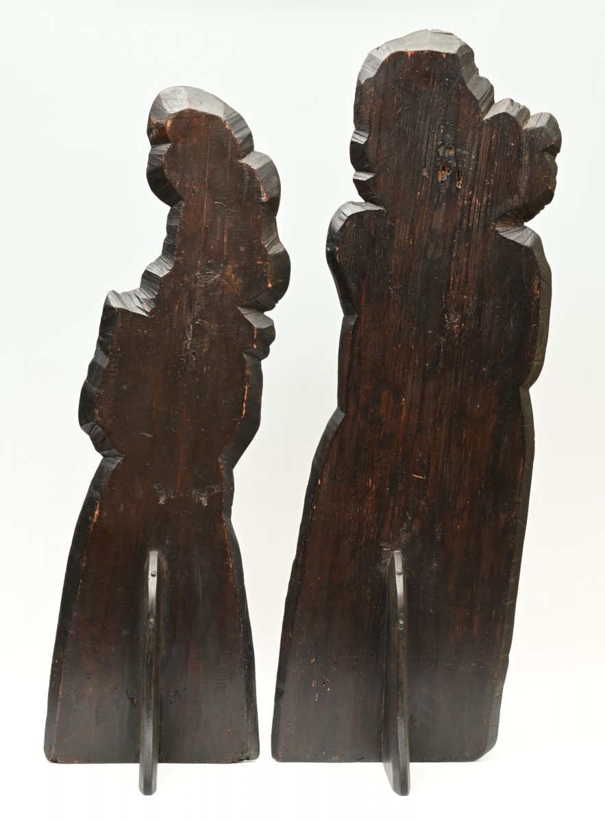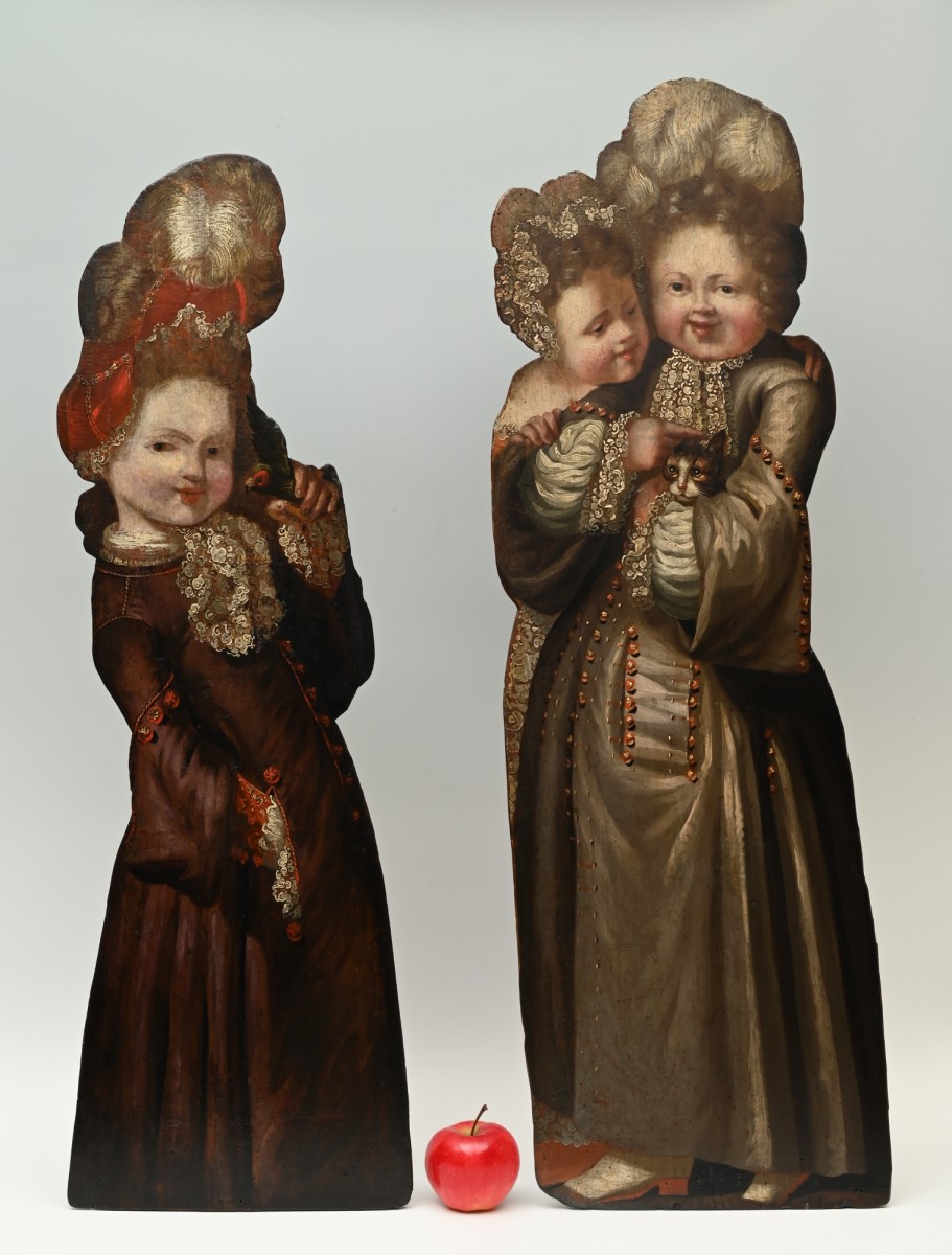Two so-called Dummy Boards made at the end of the 17th century. These flat, wooden figures, in this case of young girls, are painted in oil on pine wood.