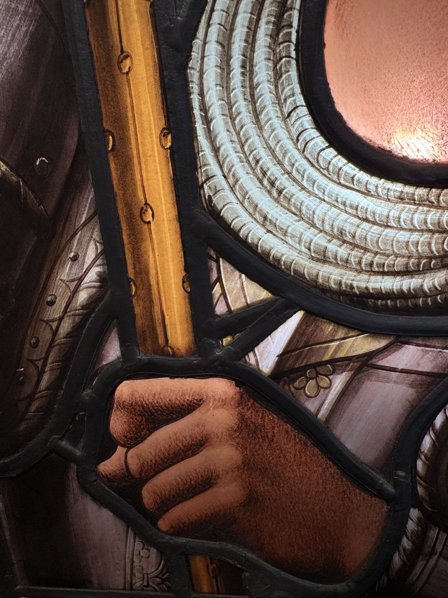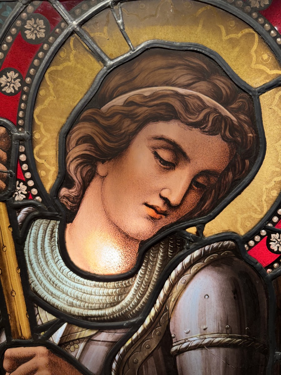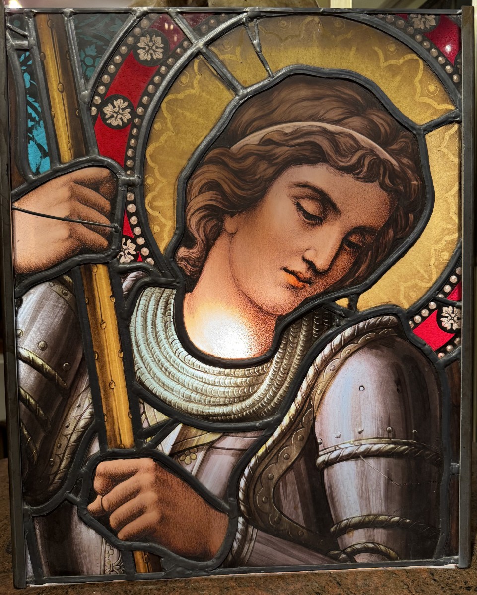 'Fragment of a stained-glass window (possibly from Chartres) depicting Saint George or Saint Michael holding a lance. Likely part of a larger stained-glass window made in France around 1830-1840. A zinc light box was added to illuminate it from behind. Polychromy is very prominent; a lead reinforcement has been added to the right hand.'
