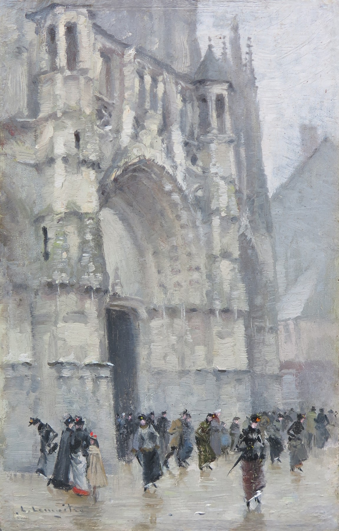 As soon as the first days of “crassinage” arrived, one could be sure of catching sight, at some street corner, of Léon-Jules Lemaître, his felt hat pulled down over his eyes, his coat collar turned up, sketching on a small “boîte à puces” a few of his little paintings, which remain as documents of Rouen in the nineteenth century.