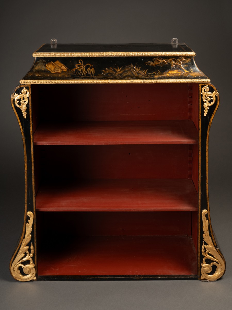 A rare rectangular cabinet with gently curved sides and a high, inverted cyma molding. The sides and top are decorated with a high-relief design in European Martin lacquer, featuring pagodas and figures in traditional dress in a lakeside setting, executed in gold powder on a black lacquer background. The interior, finished in vermilion lacquer, contains two shelves.