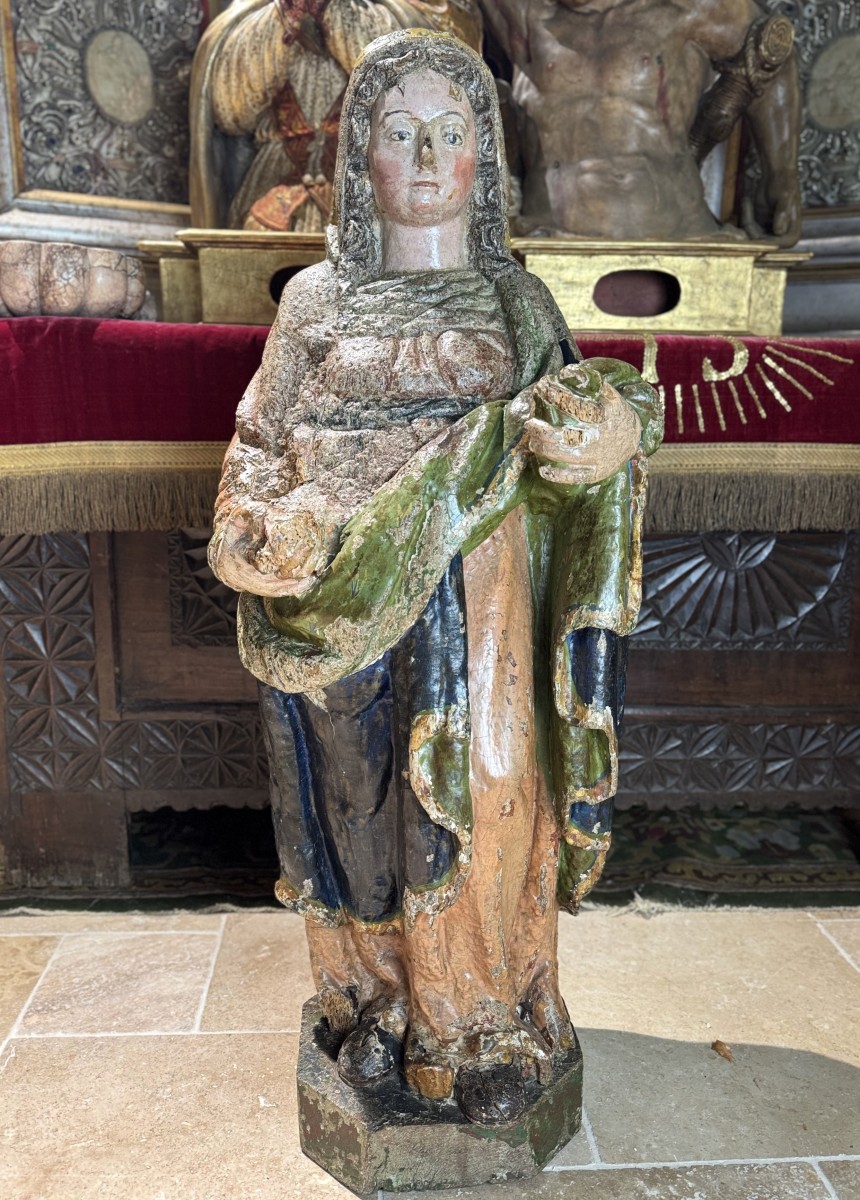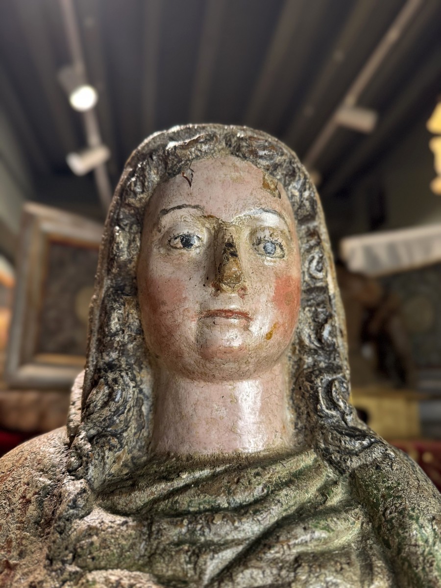 A Flemish wooden sculpture, carved in the round, depicting a saint with an expressive face. Beautiful patina with subtle polychromy. Shown standing on a hexagonal base, she holds a fold of her cloak and was originally intended for an altarpiece.