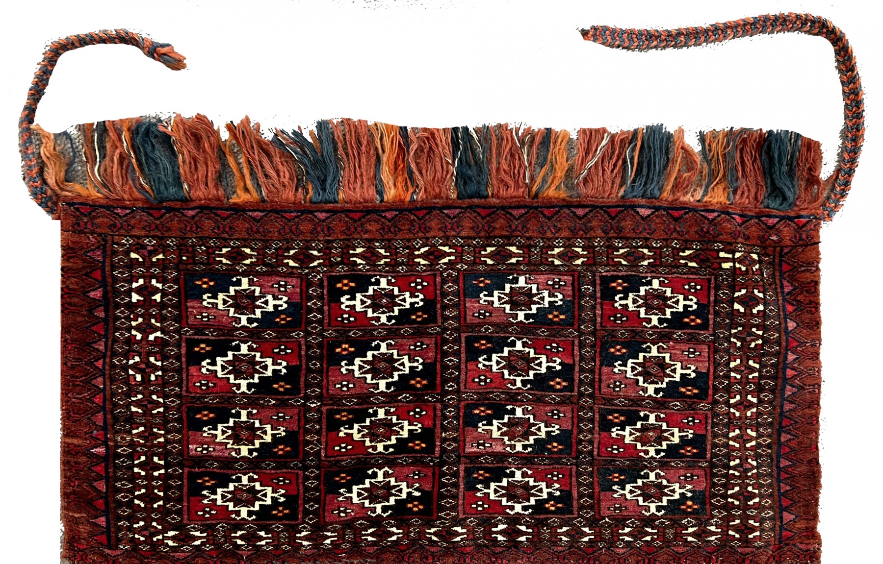 The deep palette of ruby ??reds, browns, and touches of ivory, achieved using natural dyes, lends the piece a warm visual quality and undeniable authenticity. The finely worked border and original fringes attest to its age and craftsmanship.