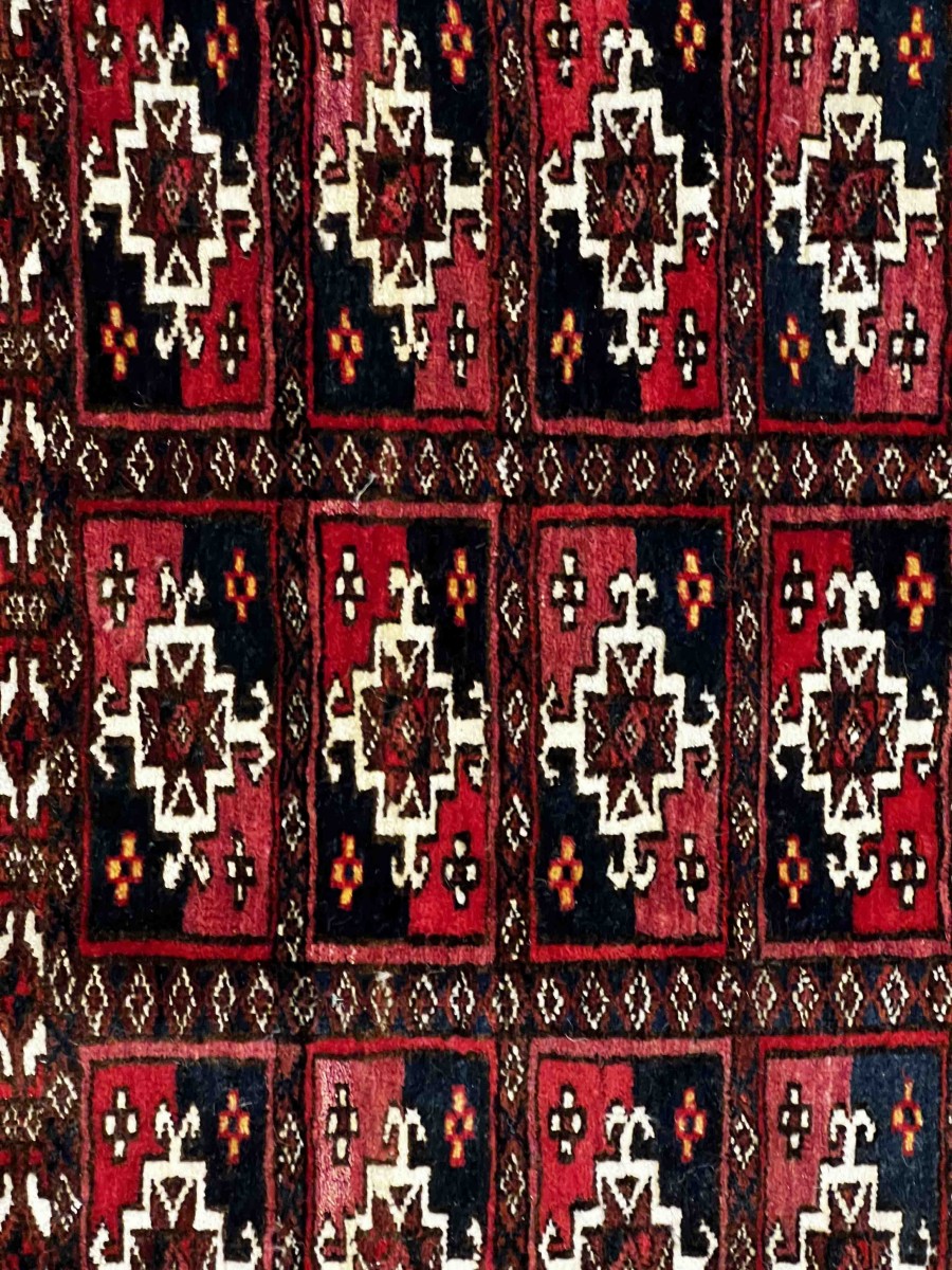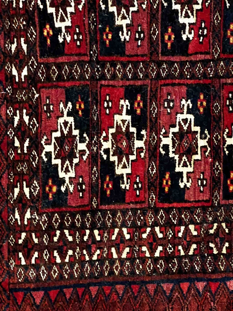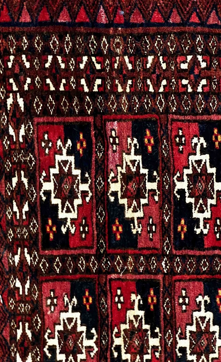 This superb antique Bukhara Tekke rug, dating from the 19th century, is a remarkable example of Turkmen craftsmanship. Its unusual size (77 × 40 cm) distinguishes it with a harmonious composition of finely drawn Tekke guls, arranged in regular fields, emblematic of this prestigious tradition.