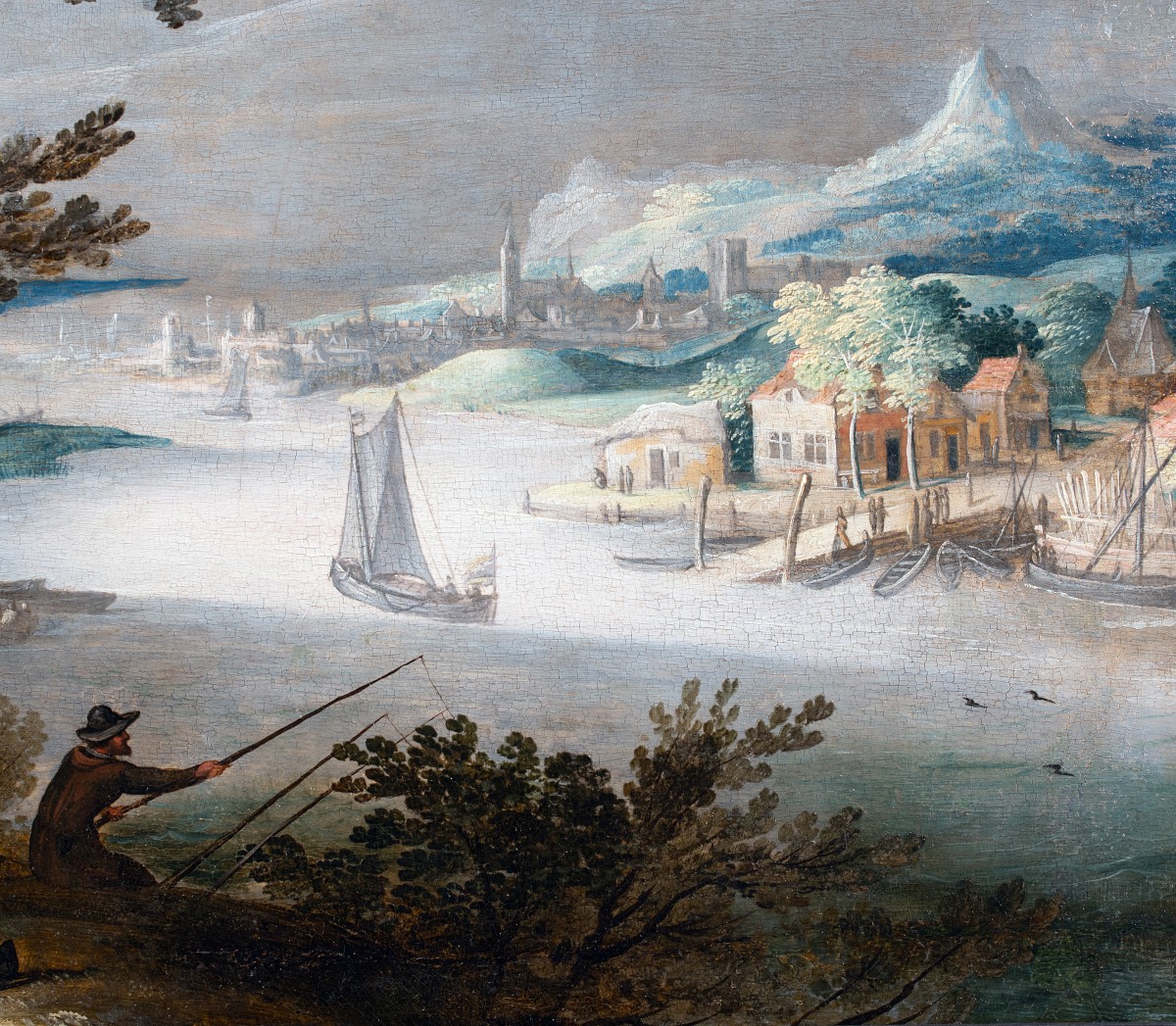 This river landscape, bathed in crystalline light and dominated by a range of celestial and aquatic blues, illustrates an idealized vision of nature as developed in Flemish workshops influenced by Italy. In the foreground, a group of figures enjoys a peaceful meal on the grass in a convivial, relaxed posture, while another person fishes nearby. Dressed in early 17th century attire, these figures embody a bucolic genre scene typical of Flemish painting. A large tree with dense foliage structures the composition and frames the scene. The river winds through the center, dotted with sailing boats and small vessels, linking the lively banks to the distant horizon. On the left, a solitary house nestles beneath the trees; on the right, a small port with quays and buildings evokes village activity. In the background, a fortified town with slender spires sits among the hills beneath a sky crossed by birds. This type of landscape, both narrative and decorative, belongs to the tradition of classical Flemish landscapes developed in Rome by Paul Bril and his followers. While Bril is often cited as the master of this genre, Willem van Nieulandt—trained within his circle—distinguishes himself through a cooler palette, more precise architecture, and a more theatrical atmosphere. The strong dominance of blue here enhances the sense of depth and lends the whole composition an almost meditative serenity.