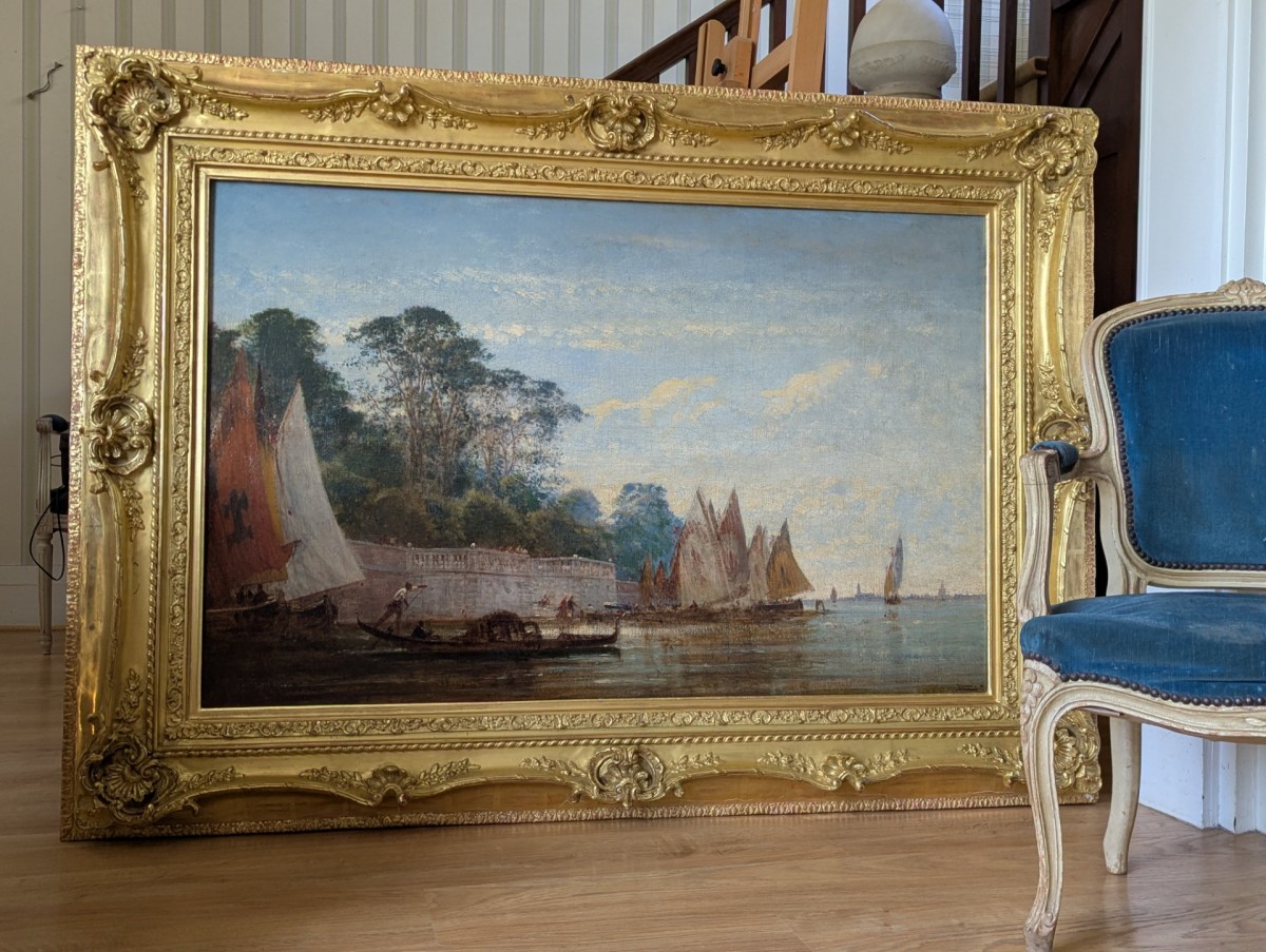 This exceptional painting by Félix Ziem offers a lively view of the main entrance to the French Gardens in Venice (commissioned and created by Napoleon I). Dated 1871, it was painted by an artist at the height of his powers, before the turn of the 1880s. The overall impression does not yet overshadow the attention to detail; quite the contrary. The color palette is, of course, very rich, but it remains somewhat restrained, even though one can discern a hint of the more autonomous, even uninhibited, colors of later decades, particularly in the central section of the trees. While they are in the background and, as such, should be discreet, the artist chooses to use a light blue with highlights of green. This central area of ??the composition then becomes central to the viewer's gaze, drawn by this color. Water and sky occupy a prominent place in Ziem's ??work; he pays particular attention to the light in his skies and the reflections in the water, and our painting is a magnificent example of this.