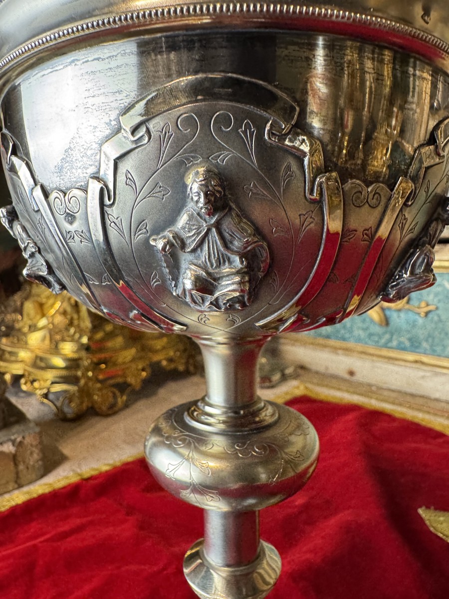 On the same foot are six biblical figures, answered by the twelve apostles, six on the cup and six on the lid surmounted by a cross. Dimensions: 33 cm, weight: 840 grams - silver and vermeil.