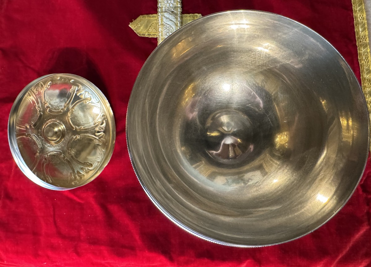 The Latin inscription "Panis angelorum factus est cibus hominum" (The bread of angels has become the food of men) is engraved on the polylobed foot.