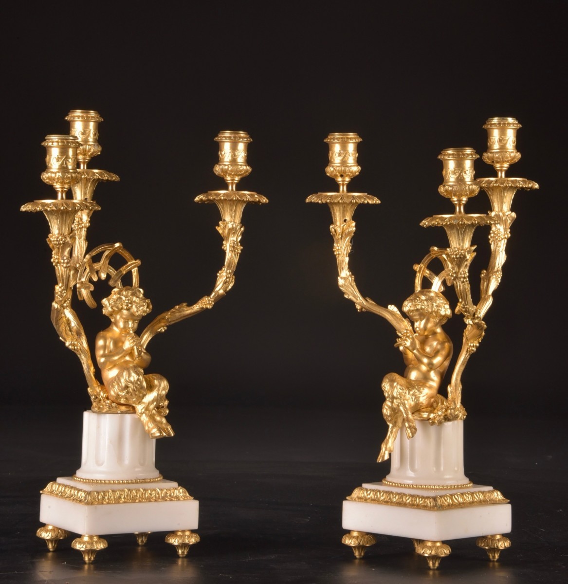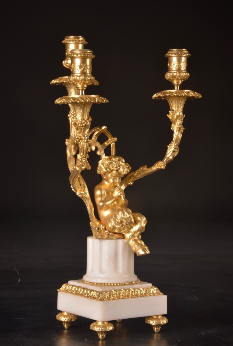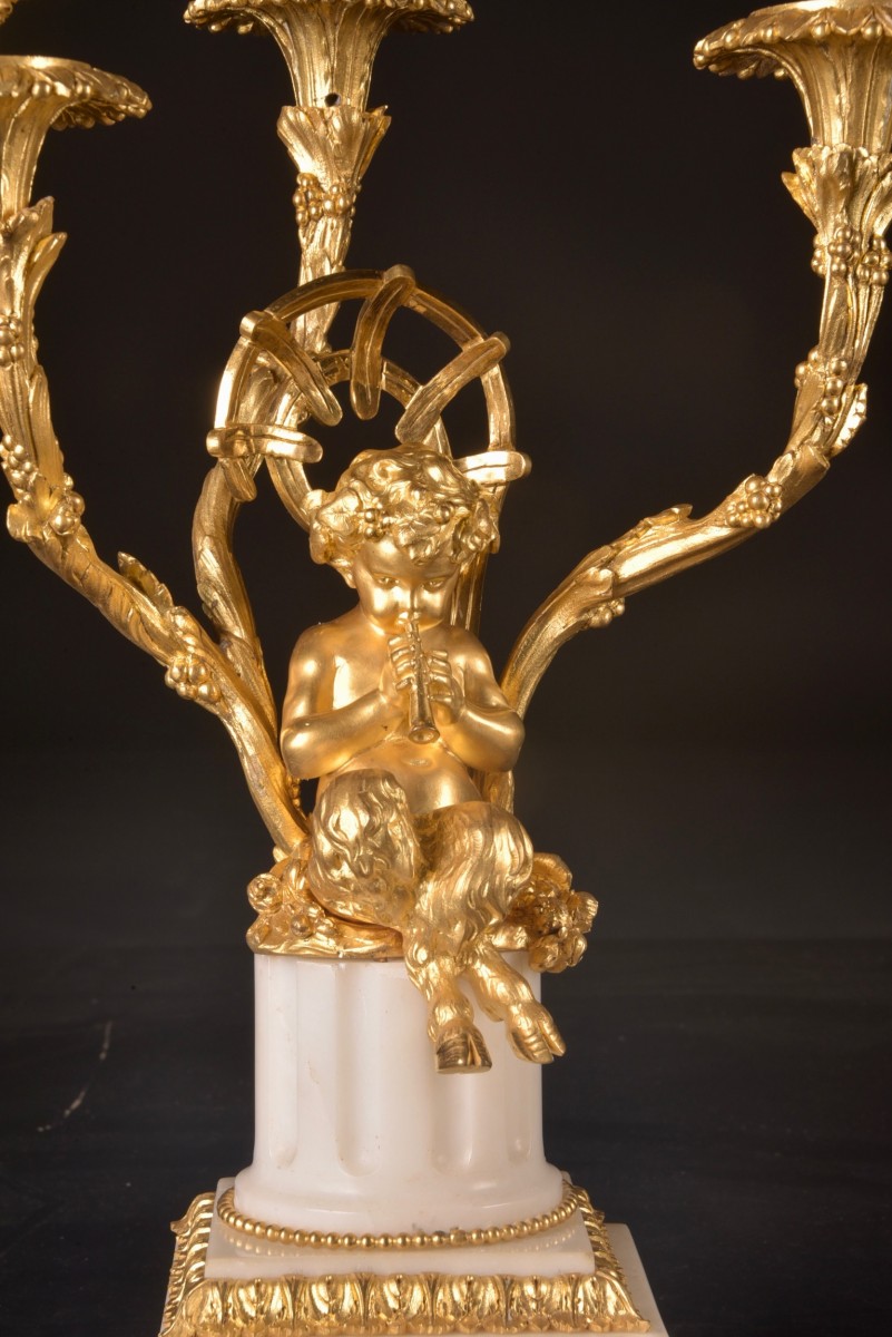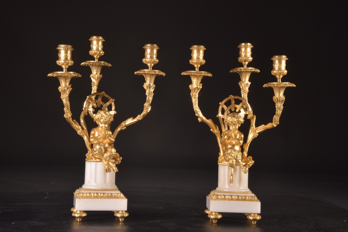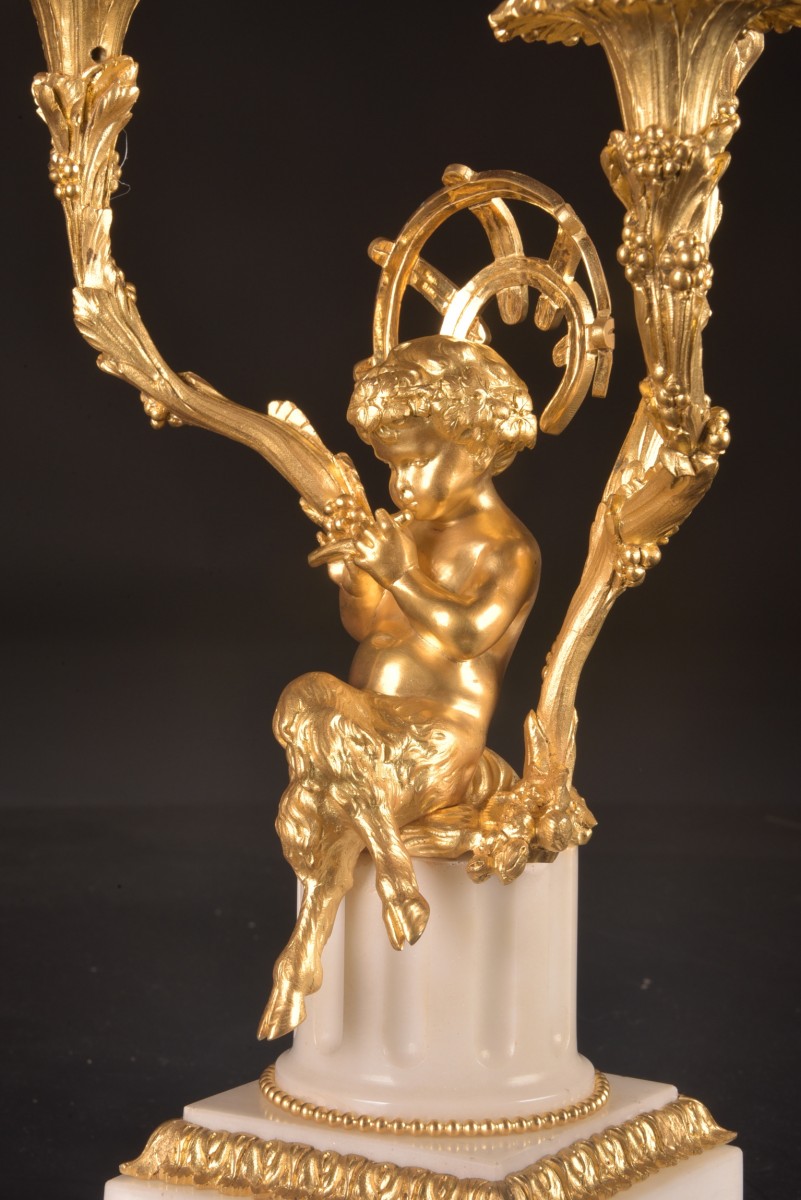 Médaille d’Or Paris 1900”, a renowned manufacturer active around 1900. It is a remarkable and harmoniously balanced set, combining high sculptural quality with a refinement characteristic of Parisian art. Dimensions: Clock: 57 × 50 (H) × 23 cm; Pair of candelabra: 45 × 30 cm