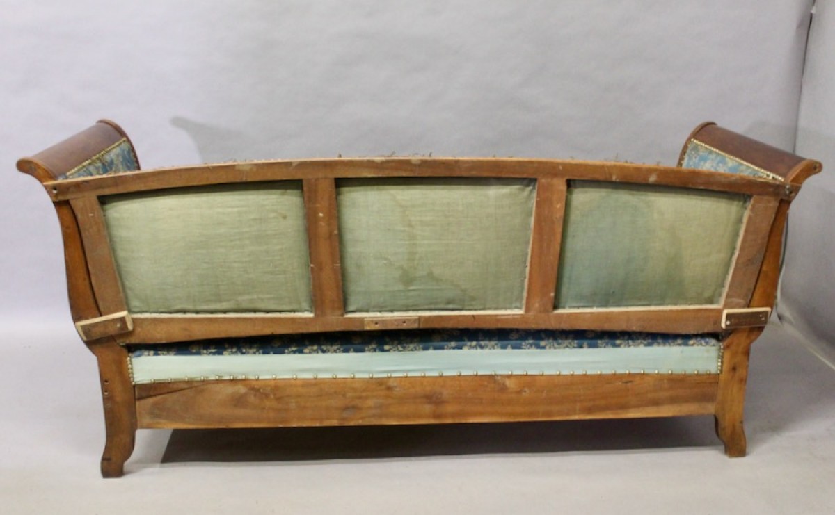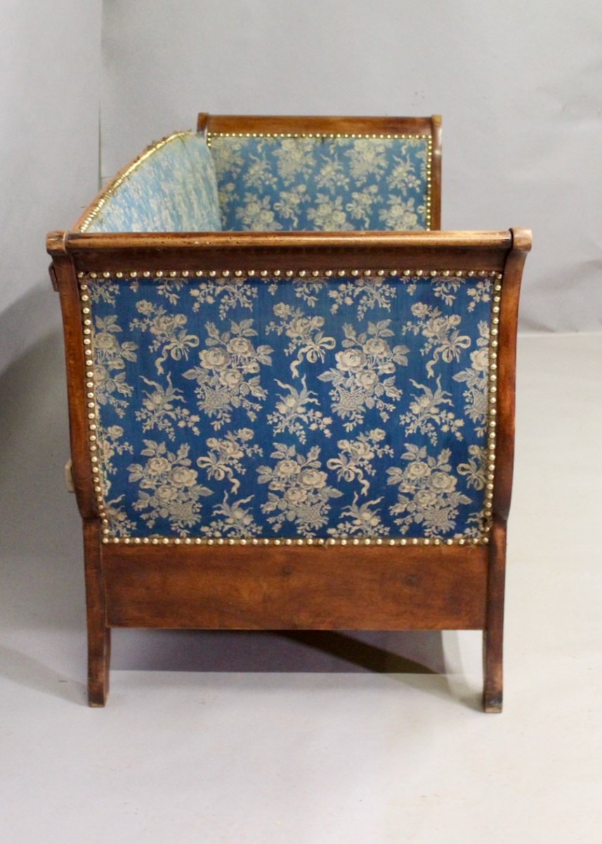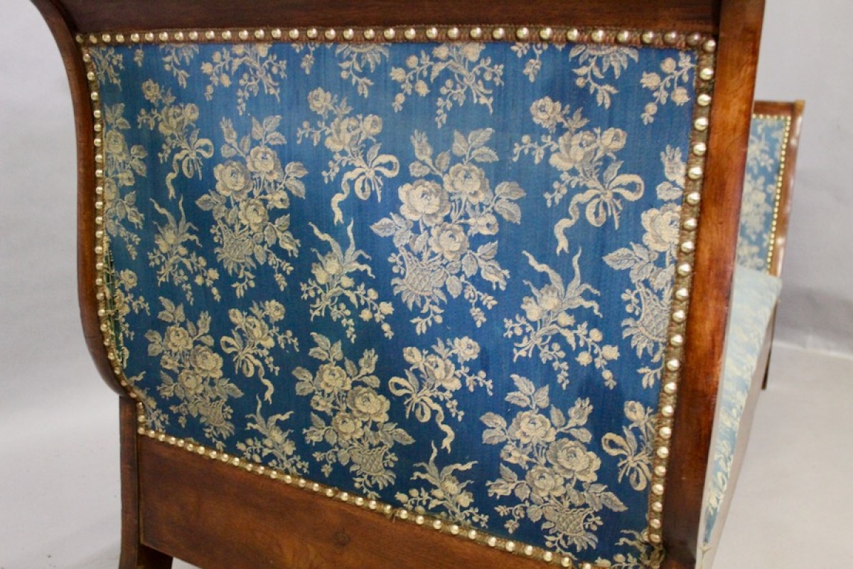 A substantial mahogany bench with a removable backrest. Charles X period, early 19th century. It features an elegant, curved design with its original upholstery (floral pattern on a blue background), which shows some wear but remains clean and in good overall condition. Dimensions: Length: 206 cm, Depth: 74 cm, Total Height: 89 cm, Seat Height: 43 cm