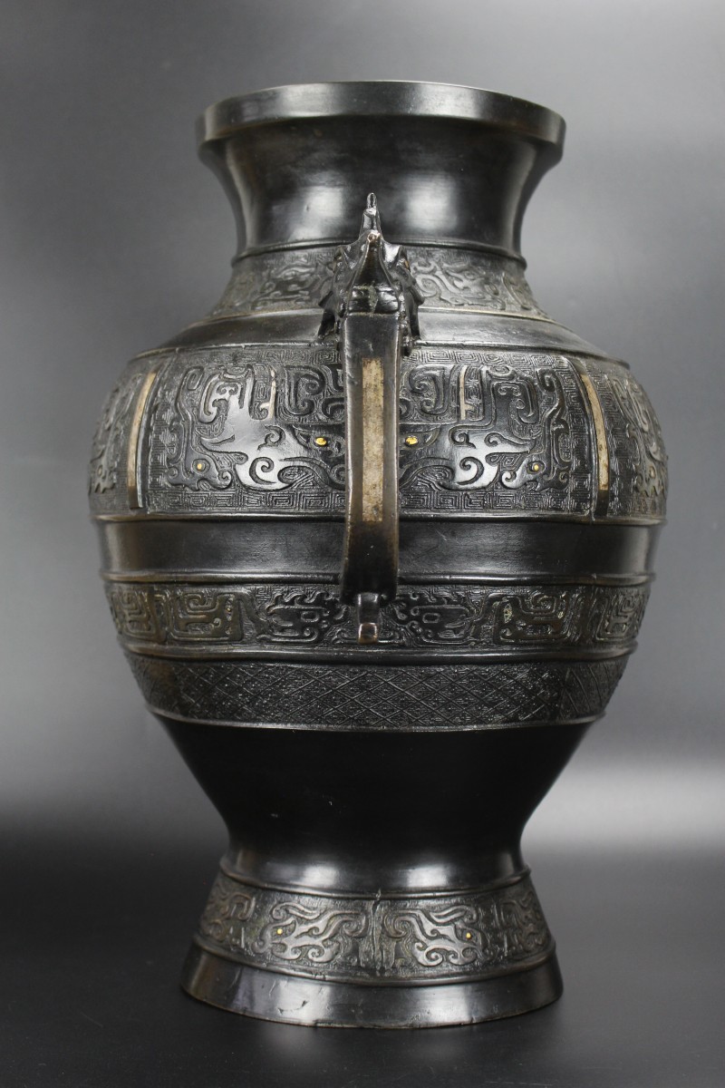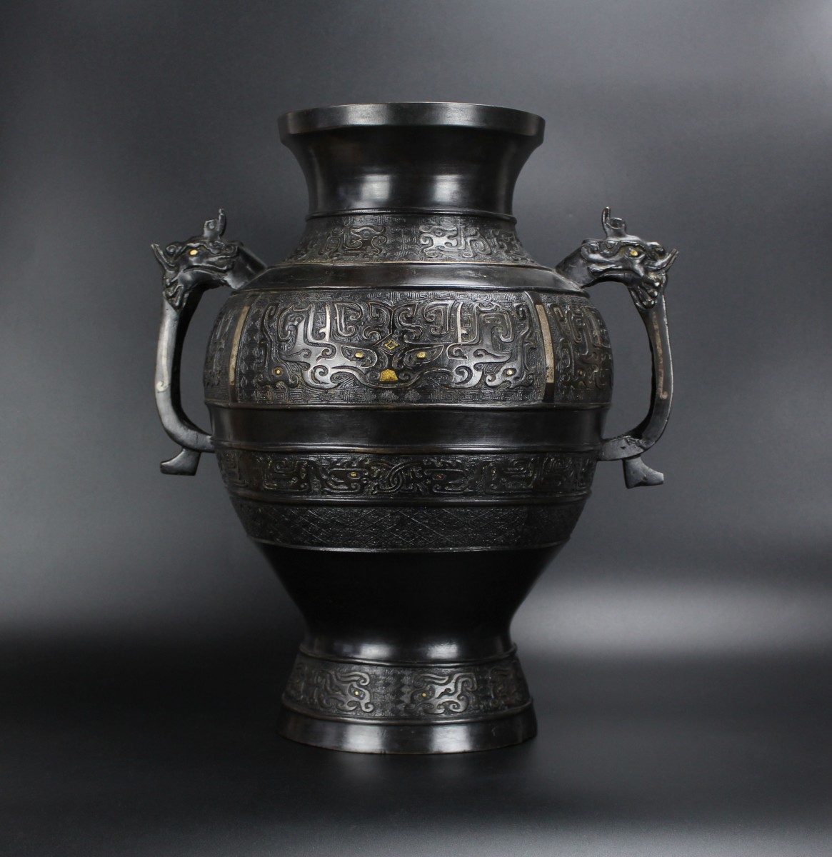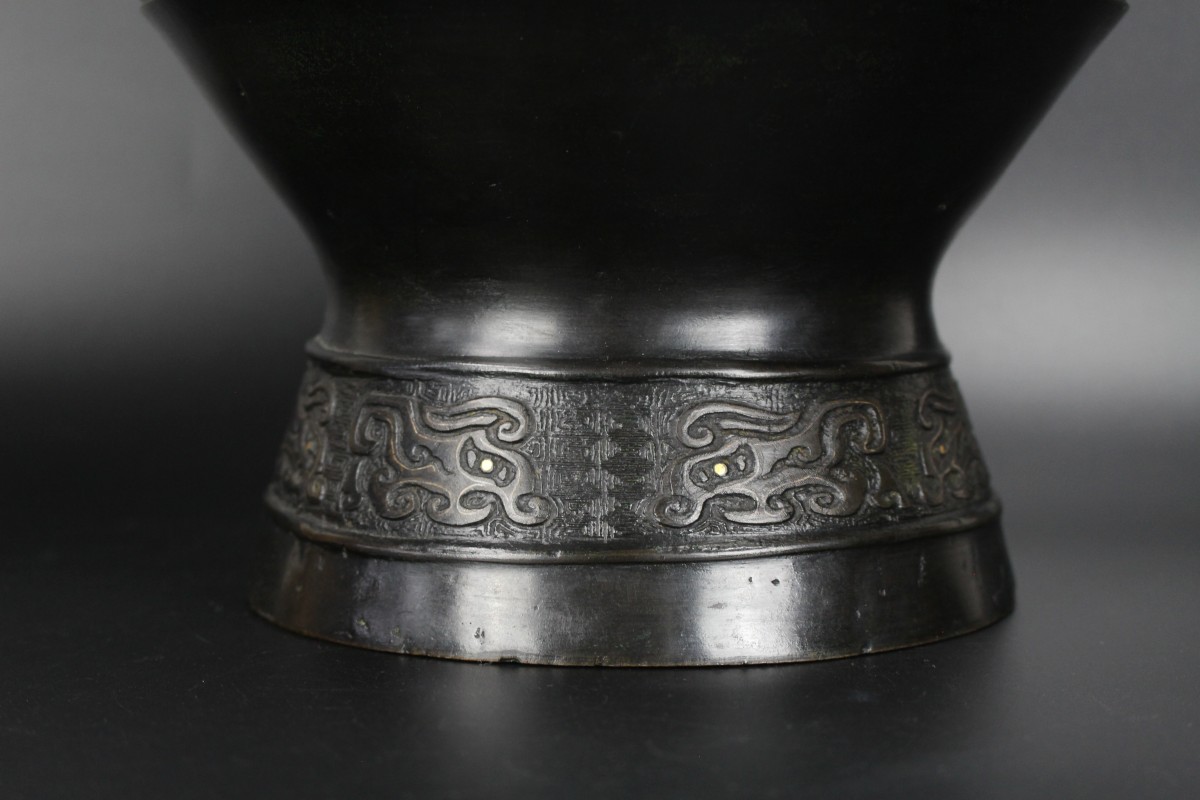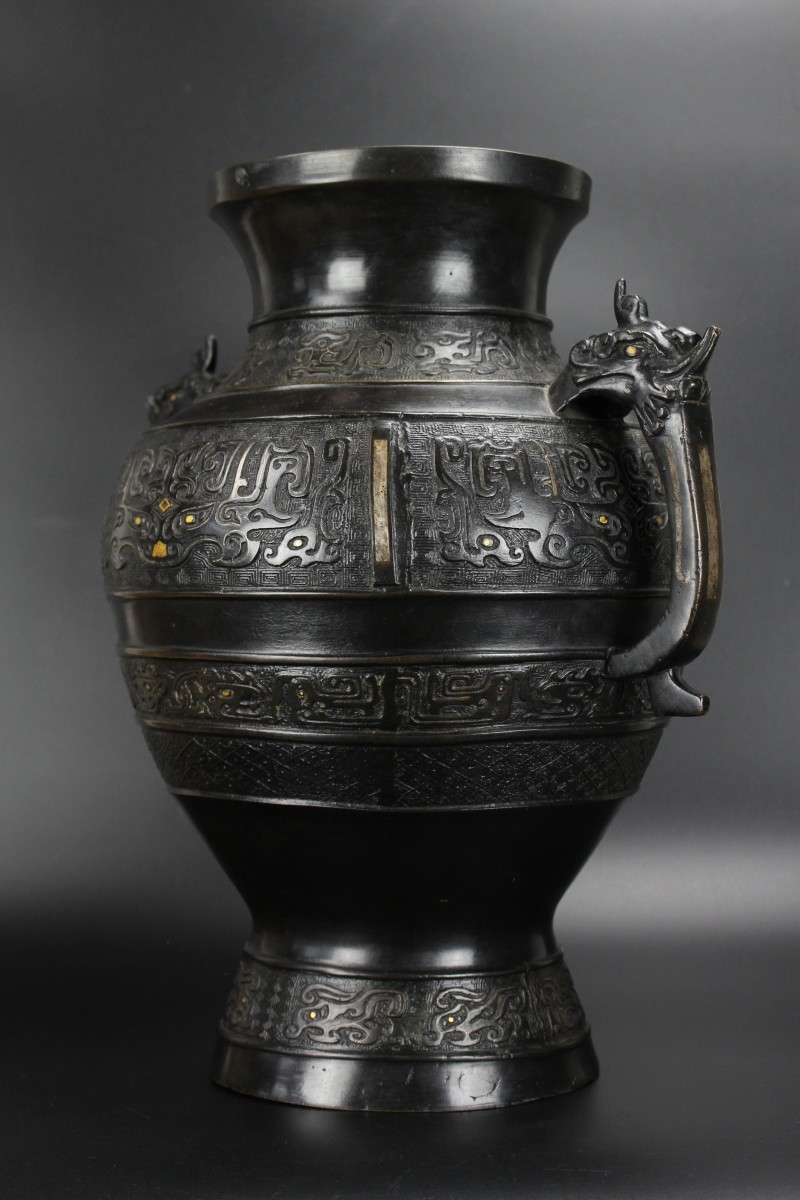 The bulbous body rising from a tall splayed foot into a waisted neck with flaring mouth and two loop handles issuing mythical beasts, cast in relief with bands of taotie masks and kui dragons against a leiwen ground. Cast bronze with cast and cold-worked decoration, damascened overlays of silver and gold.