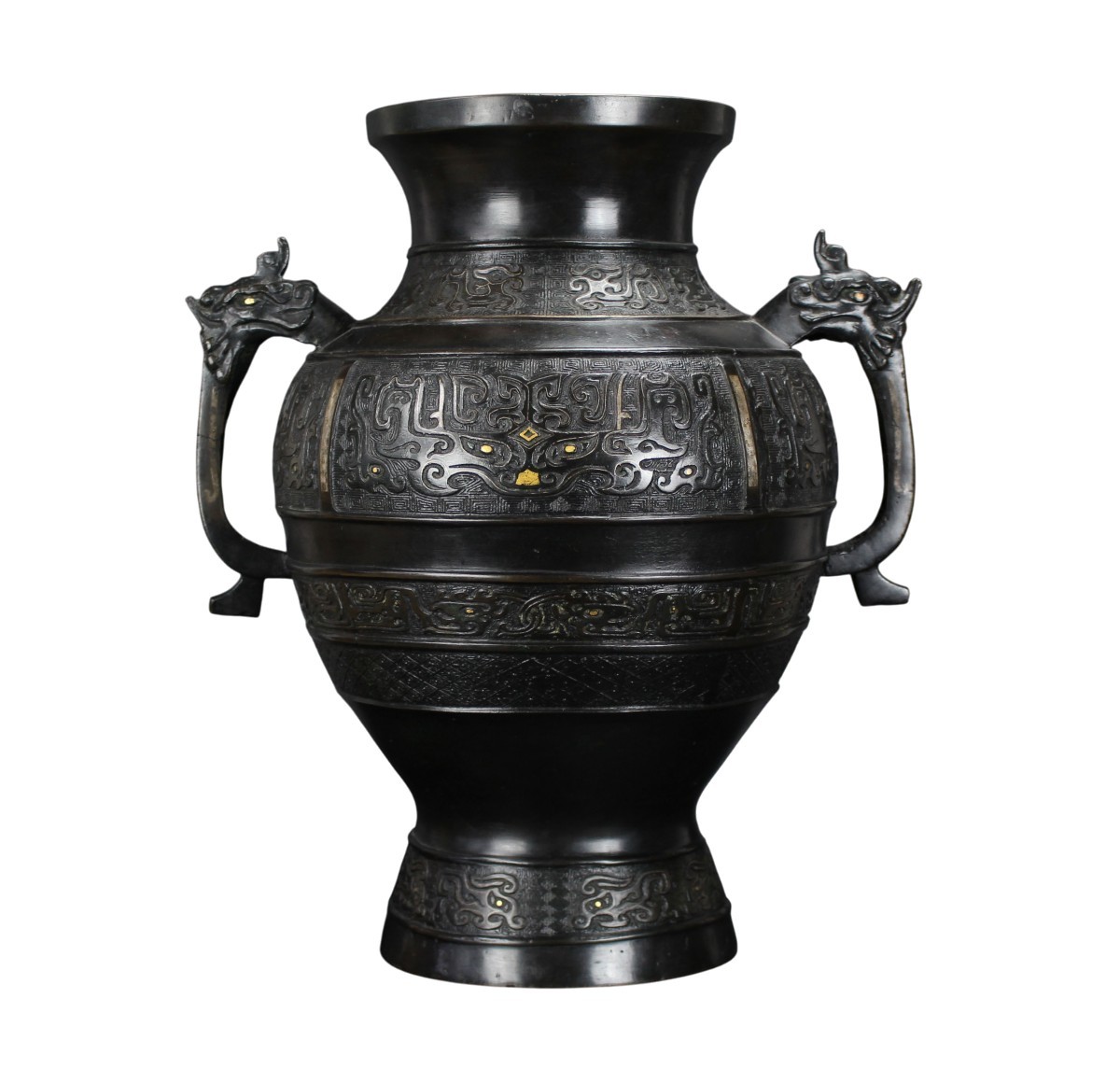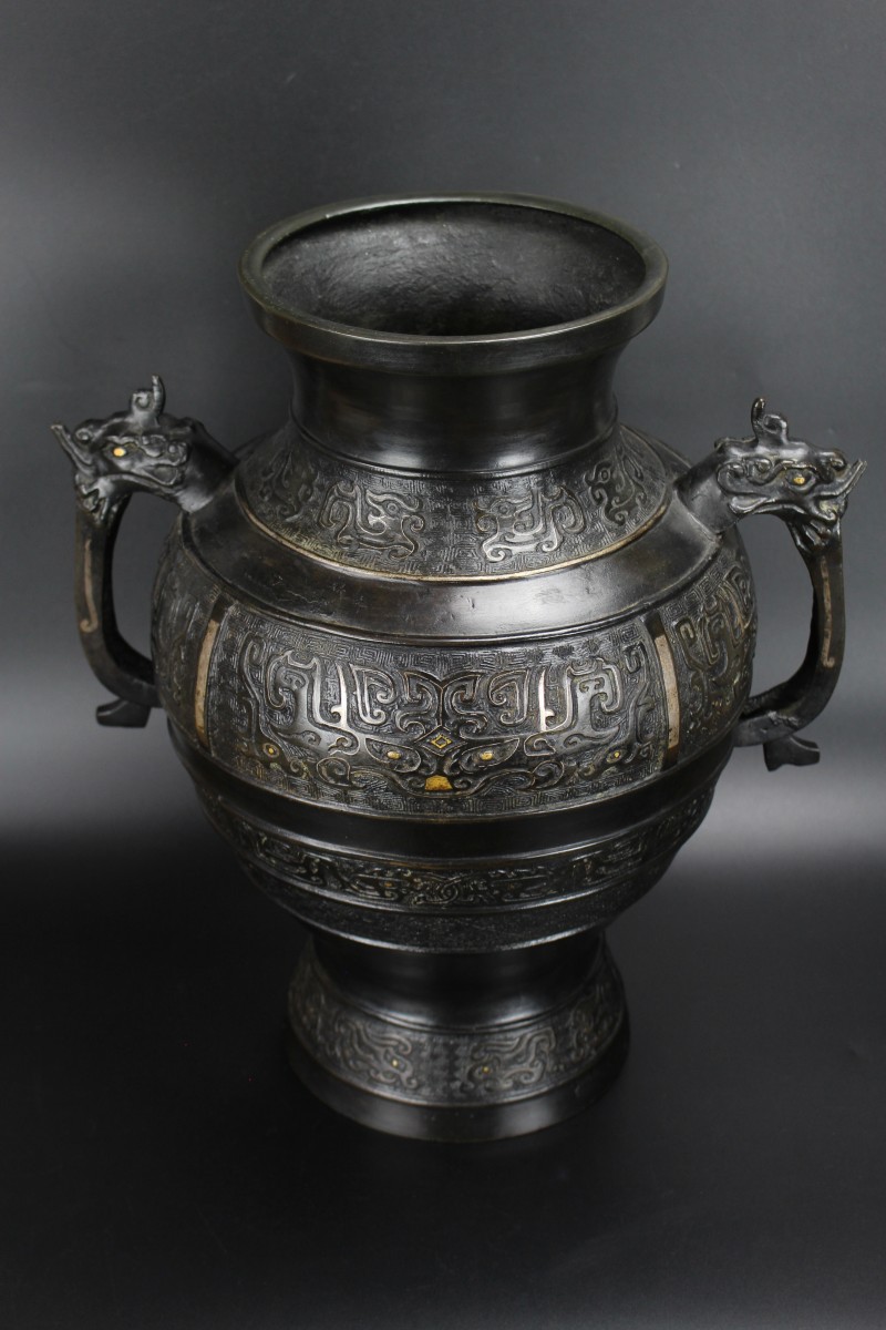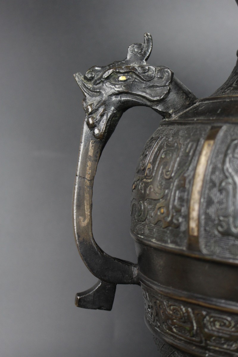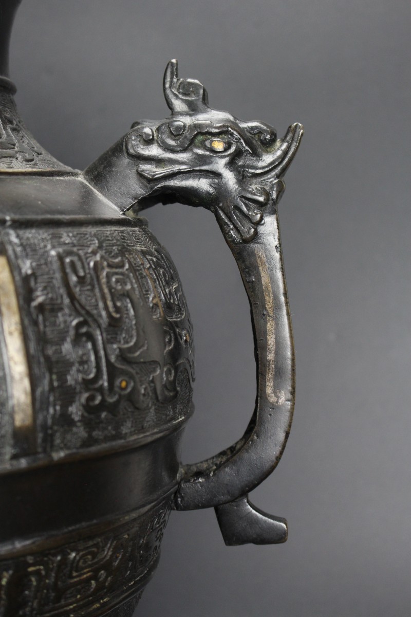 The bulbous body rising from a tall splayed foot into a waisted neck with flaring mouth and two loop handles issuing mythical beasts, cast in relief with bands of taotie masks and kui dragons against a leiwen ground. Cast bronze with cast and cold-worked decoration, damascened overlays of silver and gold.