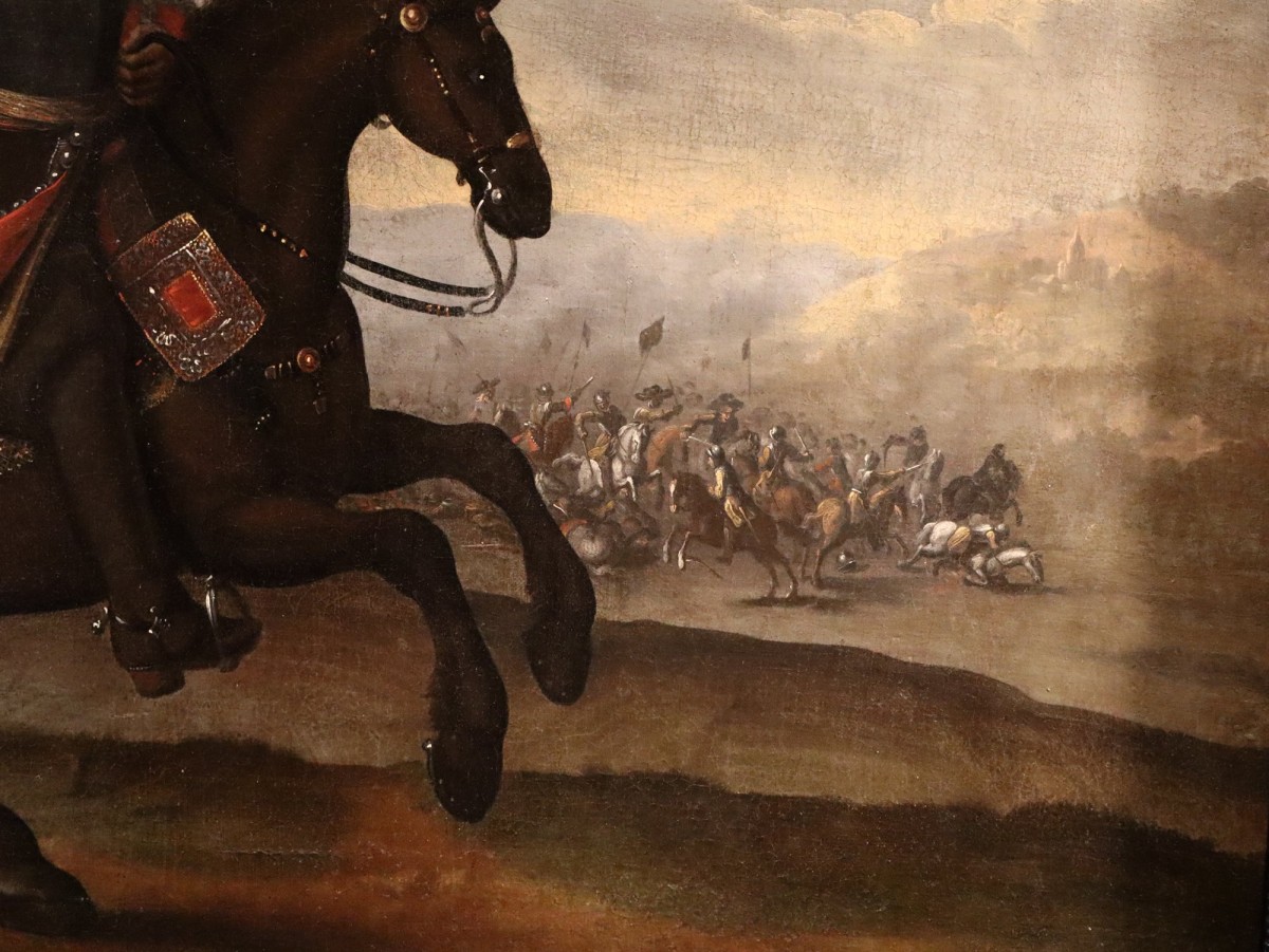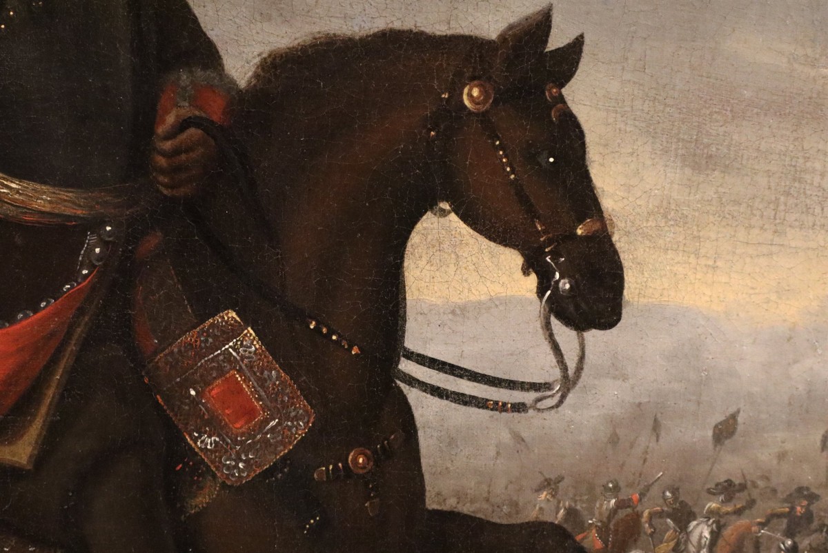 The painting in question is the work of an artist from the circle of Adam Frans van der Meulen (Brussels 1632 – Paris 1690), a French Baroque painter of Flemish origin who specialised in war scenes, and probably depicts a general in Louis XIV's army.