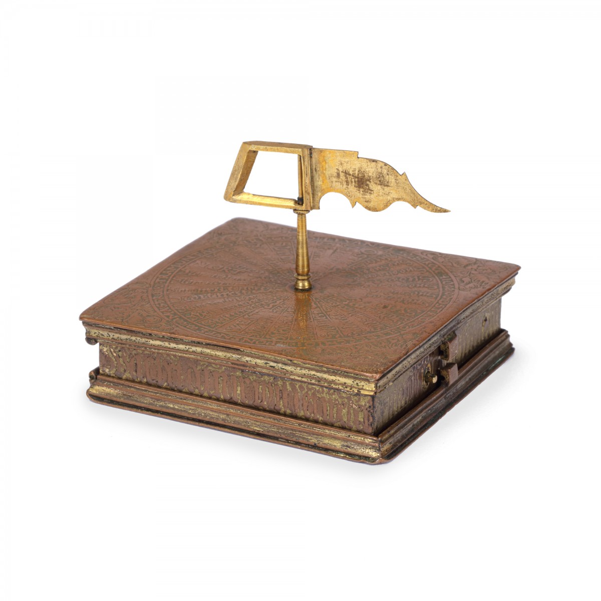 This box-shaped sundial has a double lid and is made of gilt and silvered brass. By stretching a wire between the vertical removable gnomon and the designated hole in the lower lid plate, the hours can be read on an engraved hour ring in Roman numerals and one in Arabic numerals. On part of the hour ring are remnants of gilding, indicating the hours of light. The sundial was made for a single north latitude; no place names are given. From the stated hours of sunset, one may deduce that the sundial was made for a place in southern Germany. In the lower lid plate, under a glass plate, is a compass with a compass rose. Above the compass is a movable hand. On the hour ring are the wind directions: Septentrio, Ortus, Meridies, Occasus, respectively north, east, south and west. Between the wind directions are floral motifs against a black background.