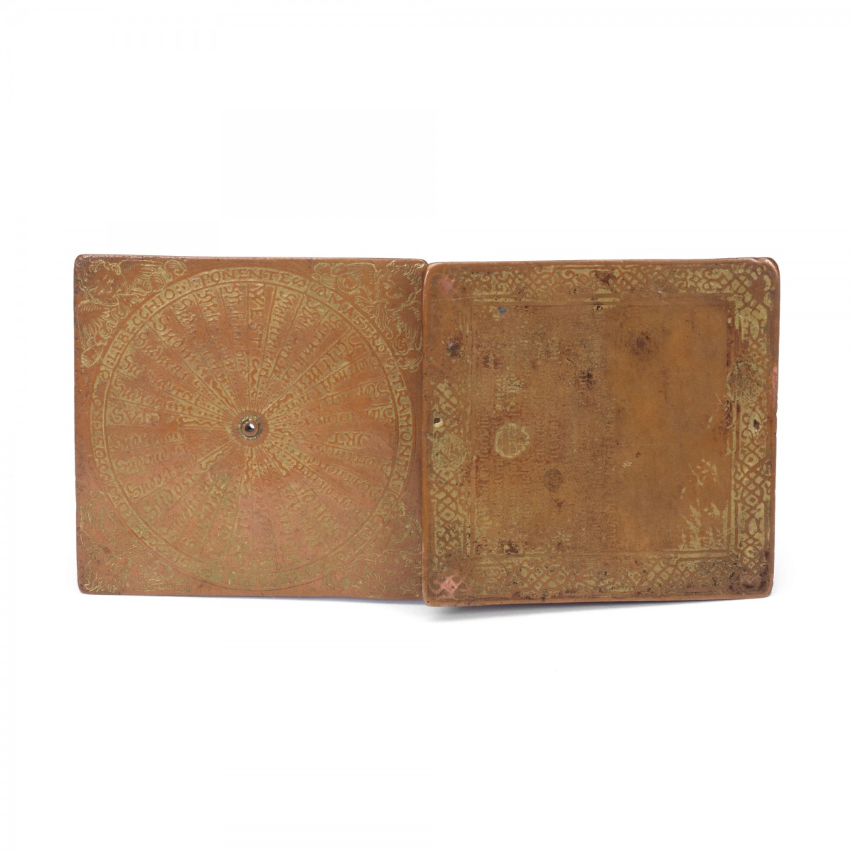 In the upper lid are three rotating wheels which indicate the days of the month and the corresponding phases of the moon. On the upper disc is engraved a moon with a face, on the second ring a sun with a face and the numerals for the calendar days. When the discs are turned to the correct date and time, the hole in the upper disc indicates the correct phase of the moon. Below these two rings is a third ring with 24-hour notation. Below this is an engraved circle with twice 1 to 12 in Roman numerals, a Latin text explaining the use of the calendar and the months. The months are indicated by letters (I, F, M, A, M, I, A, S, O, N, D) and are arranged in two rows below each other. Both lids are decorated with decorative wickerwork in the Moorish style.