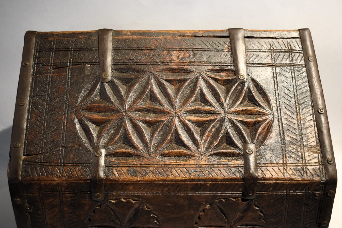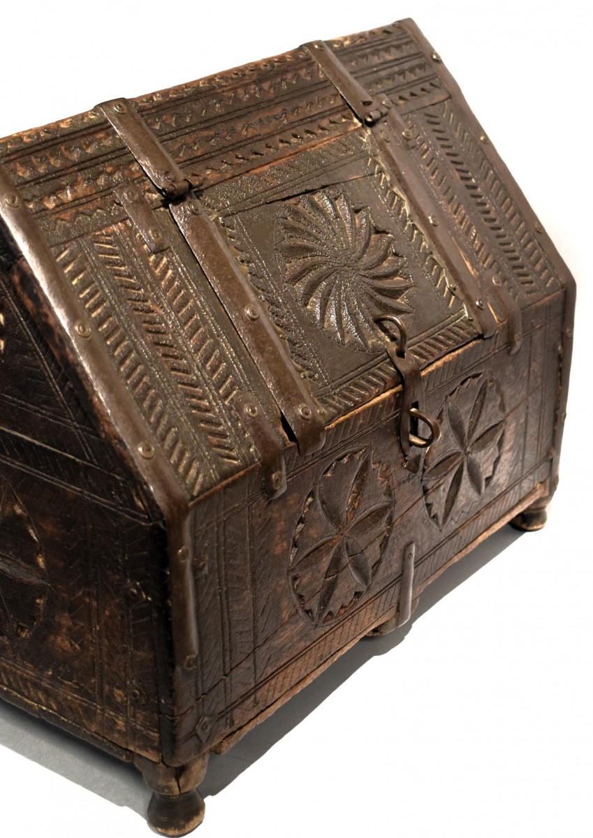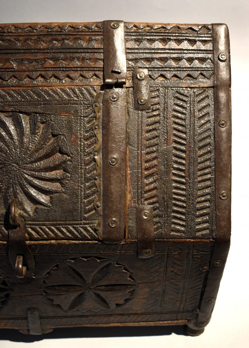 Rare and fascinating wooden dowry box, entirely carved with archaic propitiatory motifs. It comes from the Indian region of Rajasthan and was used to contain the jewels that the bride's family gave as a dowry for her daughter's wedding. The particular shape of this precious container is typical of Mughal tradition, with the small door that opens in the central part of the roof-shaped lid. The box is in excellent condition with a splendid patina of time and is original in all its parts, without any restoration.